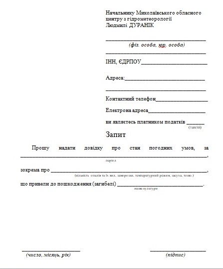 Першочерговим кроком є отримання довідки від обласного центру з гідрометеорології (наприклад, Миколаївського обласного центру з гідрометеорології). Зверніться за електронною поштою [email protected] або телефонами (0512) 47 22 92, 47 22 97. У запиті обов’язково вкажіть дату/період виникнення небезпечного явища, місце розташування посівів, надайте фотографії пошкоджених ділянок та ваші контактні дані. За можливості, організуйте спільне обстеження посівів з агрометеорологом для фіксації ступеня пошкодження та складання акту обстеження. Зразки заяви для фізичних та юридичних осіб додаються.