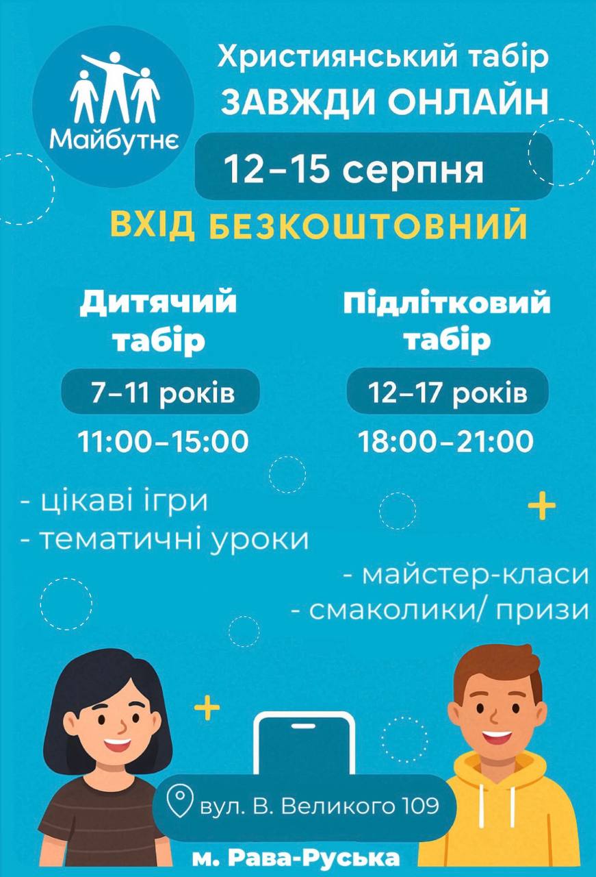 📣 Релігійна громада церкви євангельських християн-баптистів м. Рава-Руська запрошує усіх дітей та підлітків на яскраву літню подію — християнський табір «Завжди онлайн»!