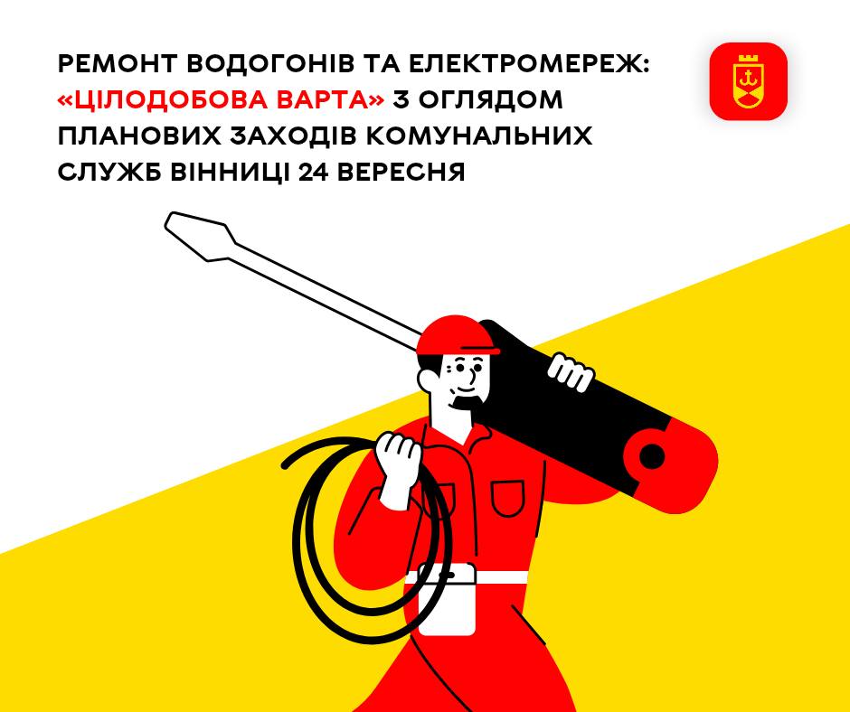 Відділ оперативного реагування «Цілодобова варта» Вінницької міської ради інформує про планові ремонтні роботи комунальних служб, які відбудуться 24 вересня у Вінниці. Ці заходи спрямовані на забезпечення стабільного функціонування критично важливих мереж міста.