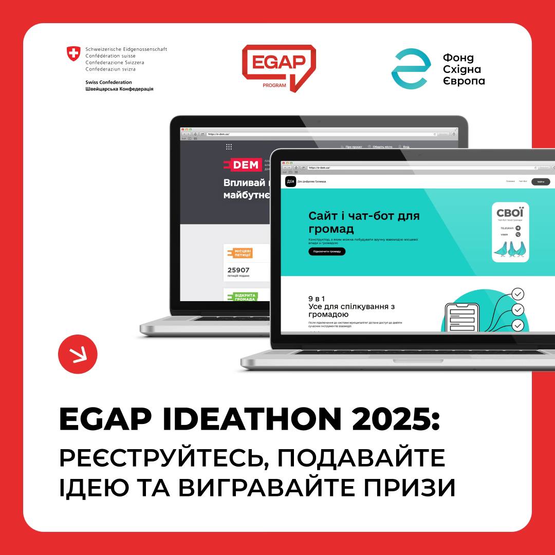 EGAP Ideathon 2025 запрошує до участі всіх, хто прагне вдосконалити цифрові інструменти СВОЇ та e-DEM. Це унікальна можливість зробити свій внесок у розвиток прозорої, ефективної та відкритої взаємодії між владою та громадянами України. Покращення цих цифрових платформ допоможе зробити державні послуги доступнішими та зрозумілішими.