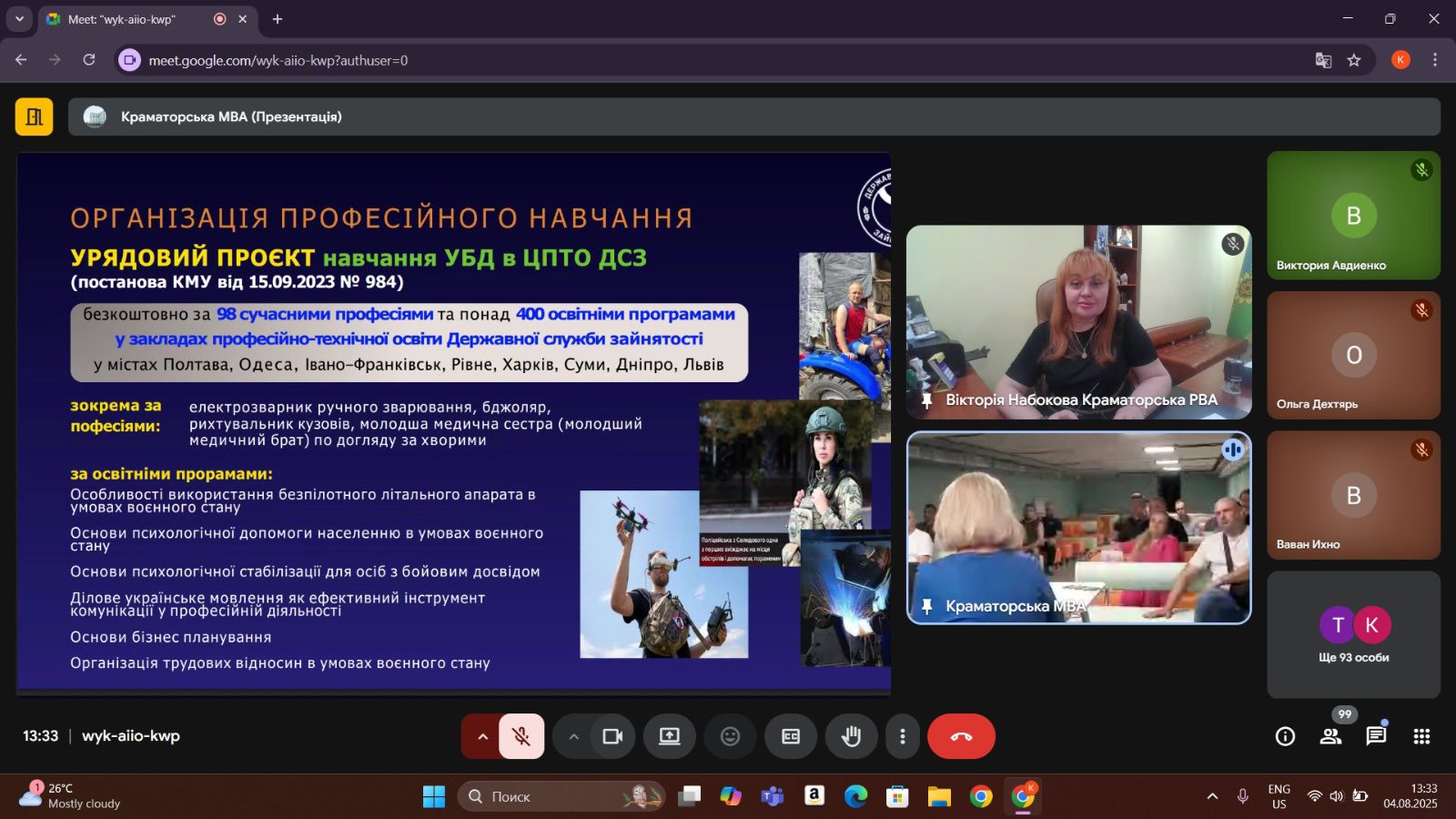 Разом з тим до діалогу долучилися ветерани, члени їхніх родин, а також представники установ, які безпосередньо працюють над розвитком ветеранських програм. Серед них — Управління з питань ветеранської політики Краматорської міської ради, Донецький обласний центр зайнятості, Головне управління ДСНС у Донецькій області та філія німецького центру протезування Prosthetics.PRO.