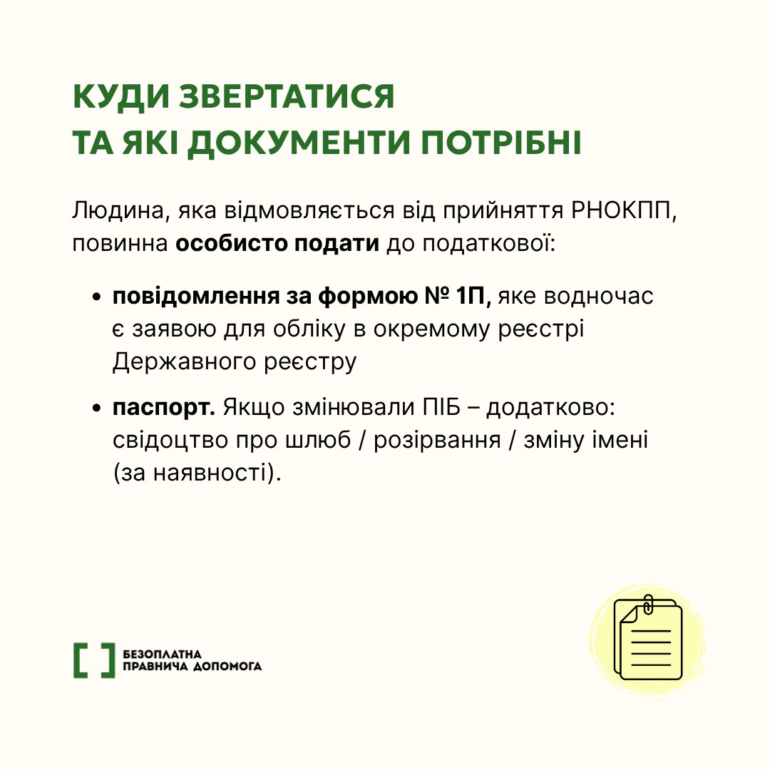 Якщо у вас виникли питання щодо відмови від РНОКПП або вам потрібна допомога у підготовці необхідних документів, ви завжди можете звернутися до системи надання безоплатної правничої допомоги (БПД).