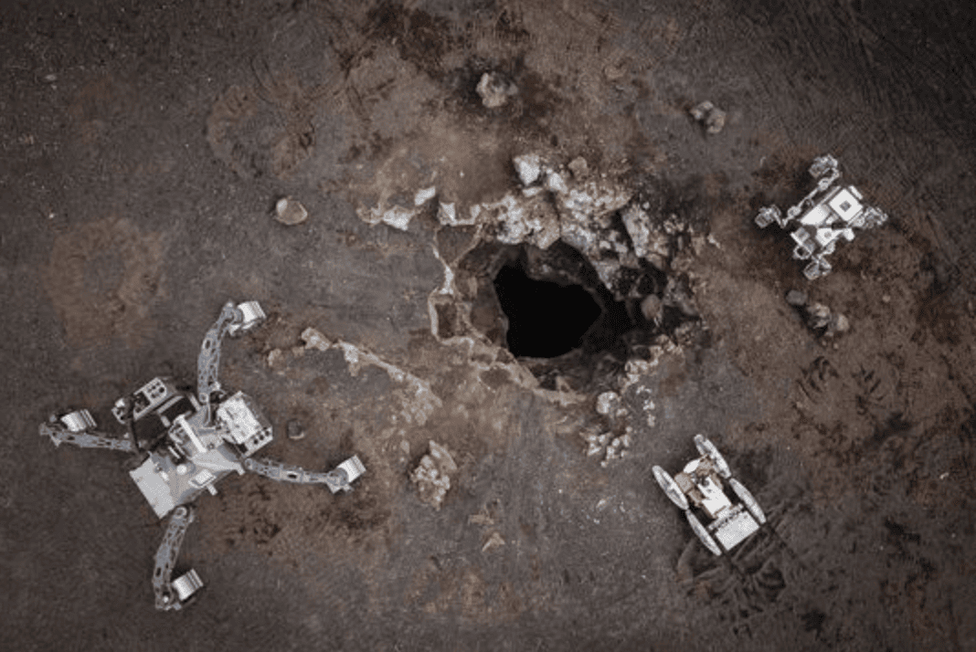 Автономні роботи оточують вхід до лавової труби під час експериментальної розвідки печери. / © Interesting Engineering
