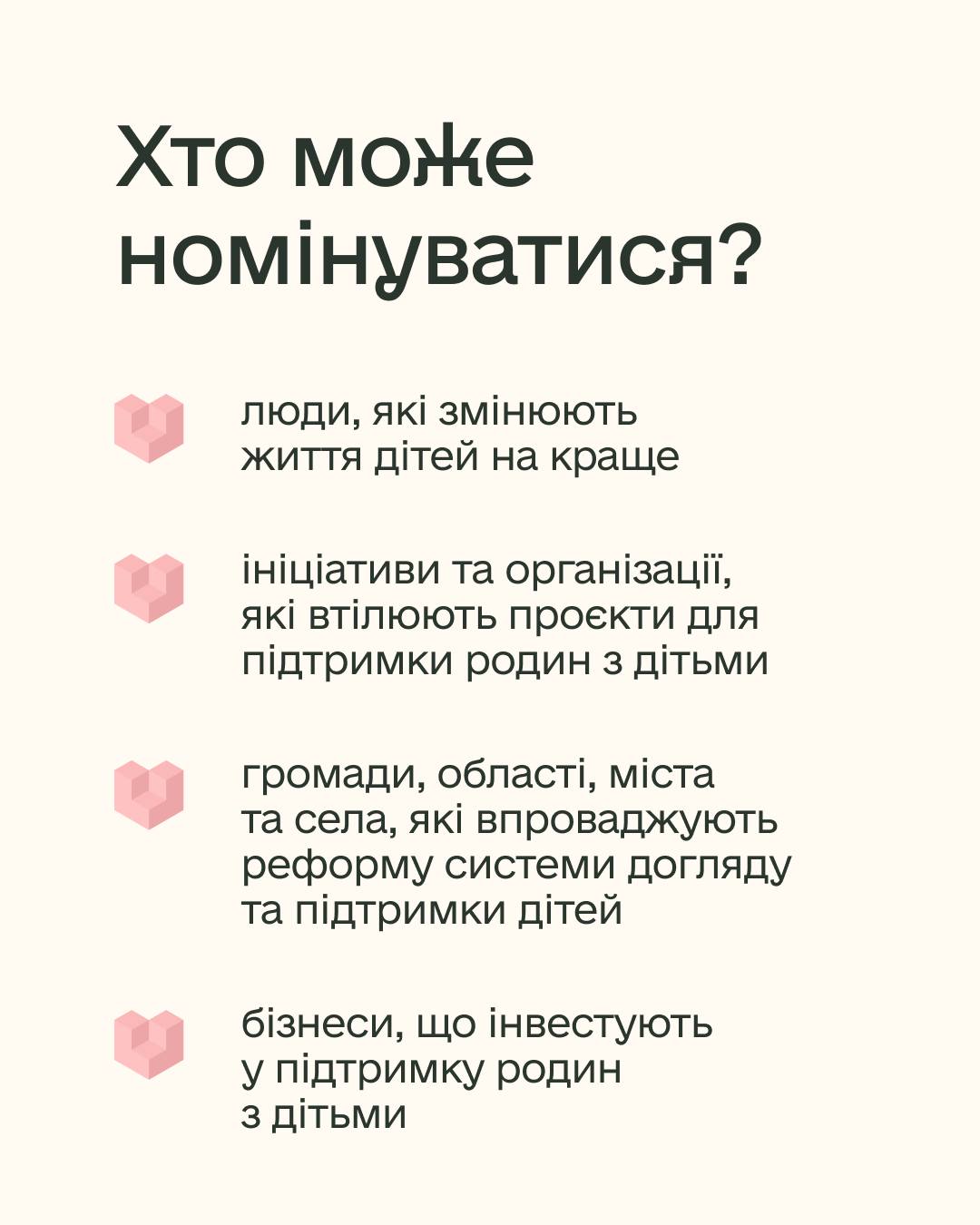 В Україні започатковується нова важлива ініціатива – “Родина для кожної дитини. Better Care Awards”. Ця премія покликана відзначити найвидатніших лідерів змін у сфері захисту прав дитини, підтримки родин та сприяння інклюзії. Головна мета – наблизити той час, коли кожна дитина в Україні матиме можливість зростати в люблячій сімейній атмосфері, оточена турботою та увагою. Це досягнення стає реальністю завдяки зусиллям численних людей, громадських організацій та бізнесів, які щодня роблять неоціненний внесок у покращення життя дітей.