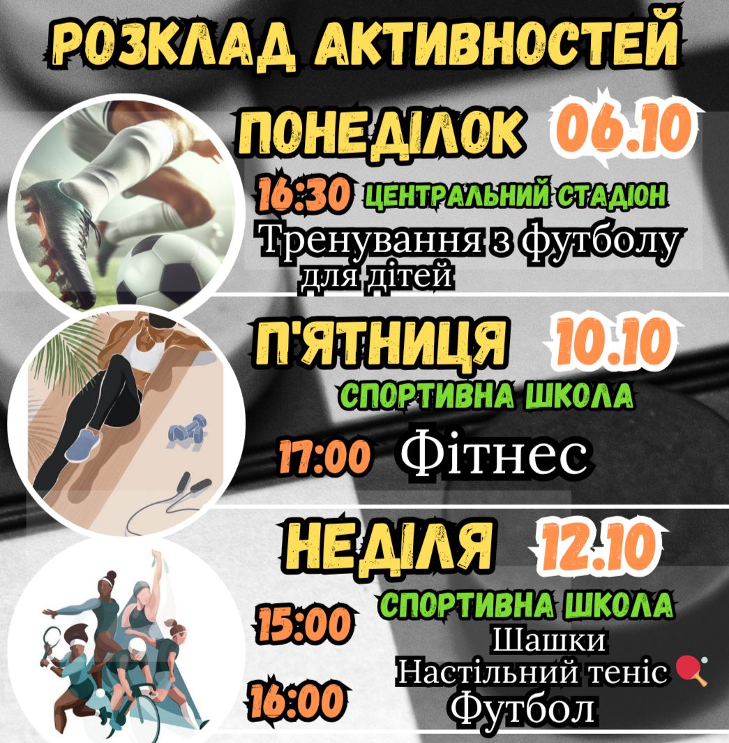* **6 жовтня, понеділок:** О 16:00 на центральному стадіоні відбудуться тренування з футболу для дітей ⚽🥅. Це чудова можливість для юних футболістів розвинути свої навички та отримати задоволення від гри.