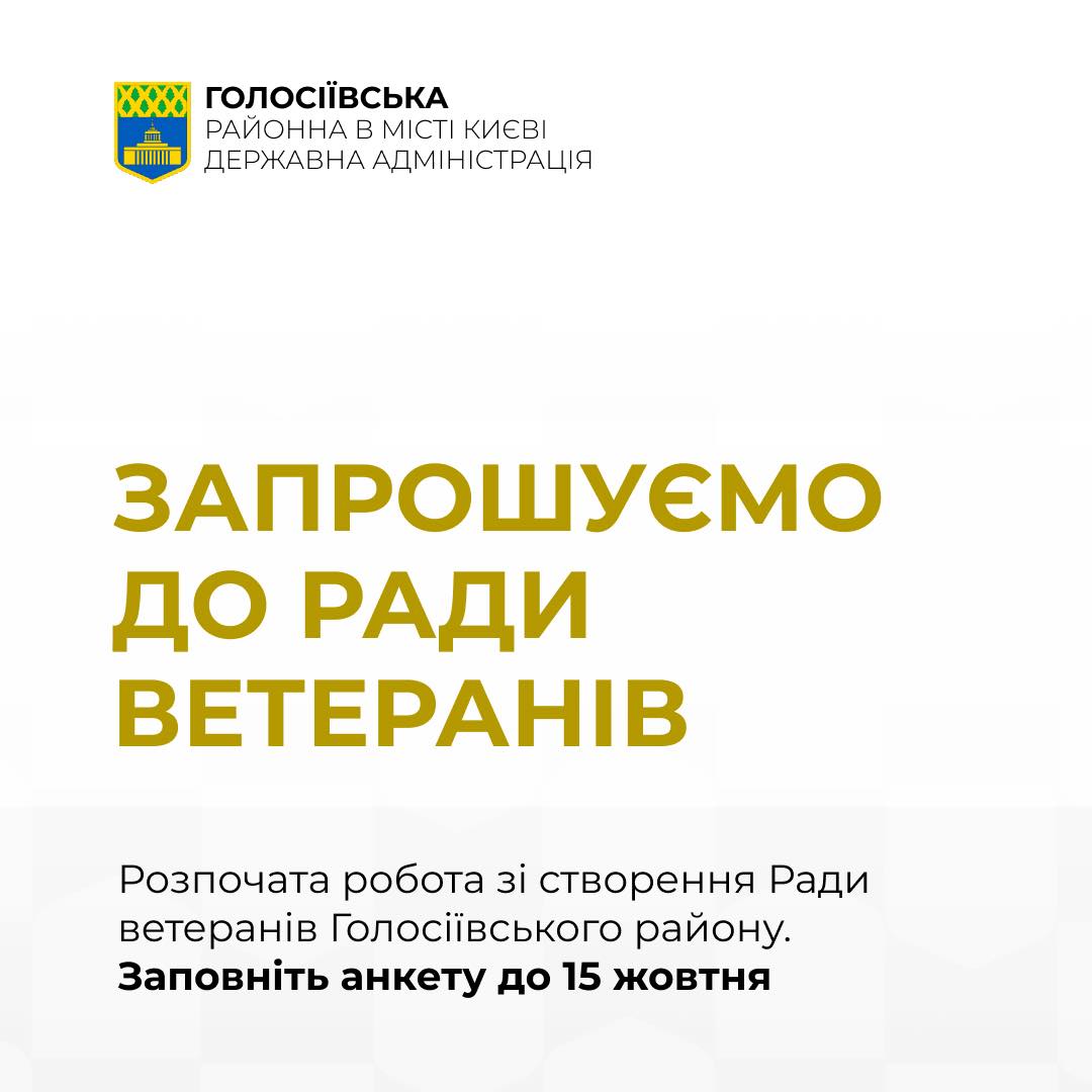 Розпочато важливу роботу зі створення Ради ветеранів Голосіївського району. Цей консультативно-дорадчий орган, що діятиме при Голосіївській районній в місті Києві державній адміністрації, стане постійним майданчиком для відкритого діалогу. Він об’єднає ветеранів, військовослужбовців, їхні родини, численні ветеранські організації та районну владу для ефективної співпраці. Ми щиро запрошуємо всіх, хто має досвід захисту Батьківщини, та представників ветеранських організацій долучитися до формування цієї важливої структури. Щоб взяти участь у формуванні Ради, будь ласка, заповніть анкету за посиланням: https://forms.gle/7CMRzuaRg5kyFJBj6. Заповнити анкету можна до 15 жовтня 2025 року. Для отримання додаткової інформації звертайтеся за телефоном: (044) 257 71 33. Створення Ради ветеранів Голосіївського району має на меті не лише налагодити діалог, але й надати практичну допомогу. Рада зможе ініціювати важливі для громади району проєкти, активно впливати на прийняття рішень, що безпосередньо стосуються ветеранської спільноти. Особлива увага буде приділена підтримці у працевлаштуванні, реабілітації та забезпеченні належного соціального захисту як самих ветеранів, так і членів їхніх сімей. Цей простір стане місцем для обміну цінним досвідом та взаємної підтримки, що є надзвичайно важливим для людей, які присвятили своє життя захисту країни. Ми прагнемо створити атмосферу, де кожен ветеран відчуватиме всебічну підтримку, його думка буде почута, а можливості для самореалізації будуть максимально розкриті. Ваша участь та допомога у поширенні цієї інформації допоможуть нам досягти поставлених цілей. Поширення інформації про створення Ради ветеранів є важливим кроком для об’єднання спільноти. Ми будемо вдячні за максимальне поширення цієї новини серед ваших знайомих та колег. Це спільна справа, яка стосується кожного, хто цінує внесок наших захисників. Ми віримо, що Рада ветеранів Голосіївського району стане ефективним інструментом для покращення життя ветеранів у нашій громаді.