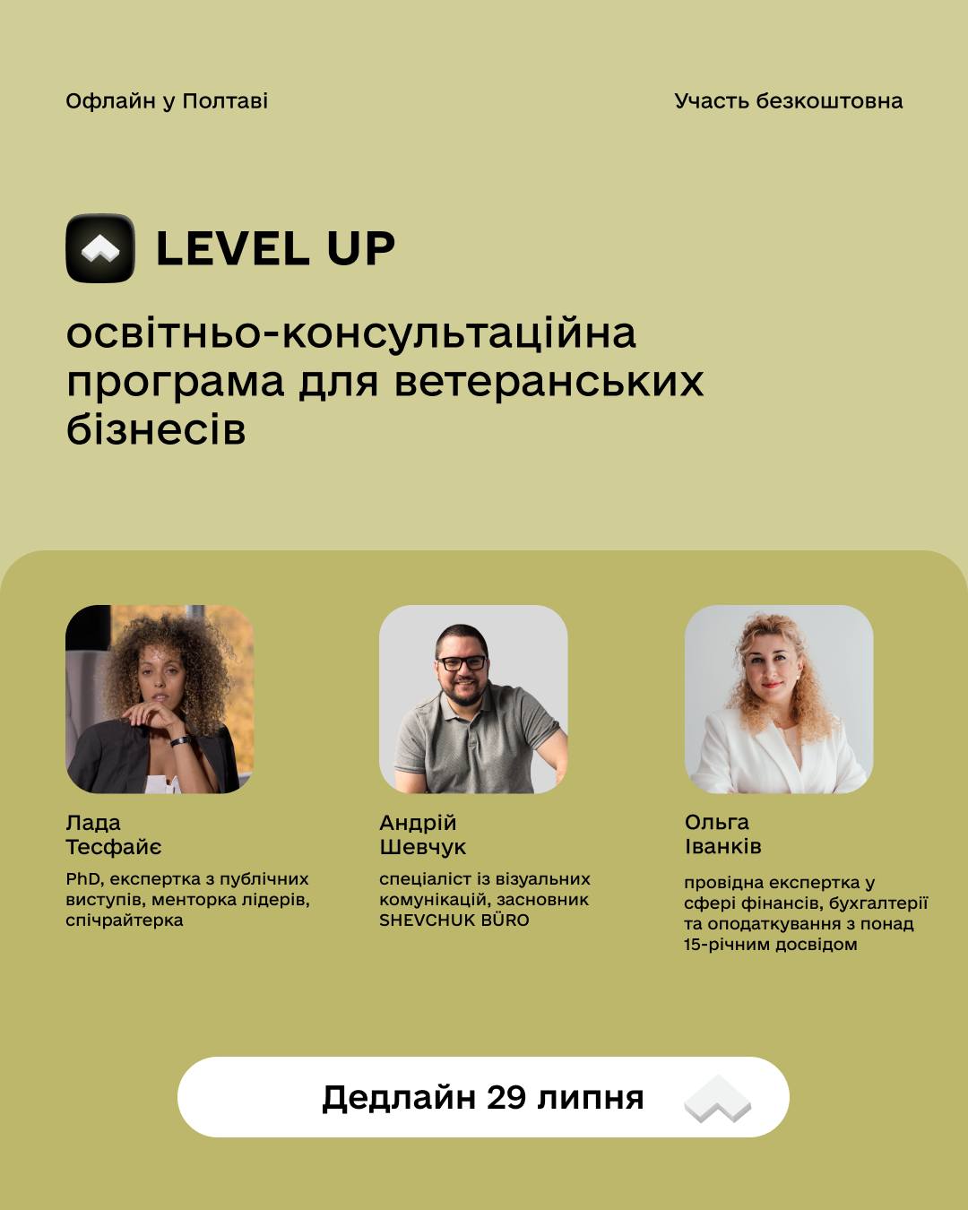 Розпочато набір учасників на інноваційну освітньо-консультаційну програму “Level UP”, призначену для ветеранів, ветеранок та їхніх подружжів, які прагнуть розвивати власний бізнес. Ця програма створена для тих, хто бажає посилити свої компетенції у ключових сферах підприємництва.📈