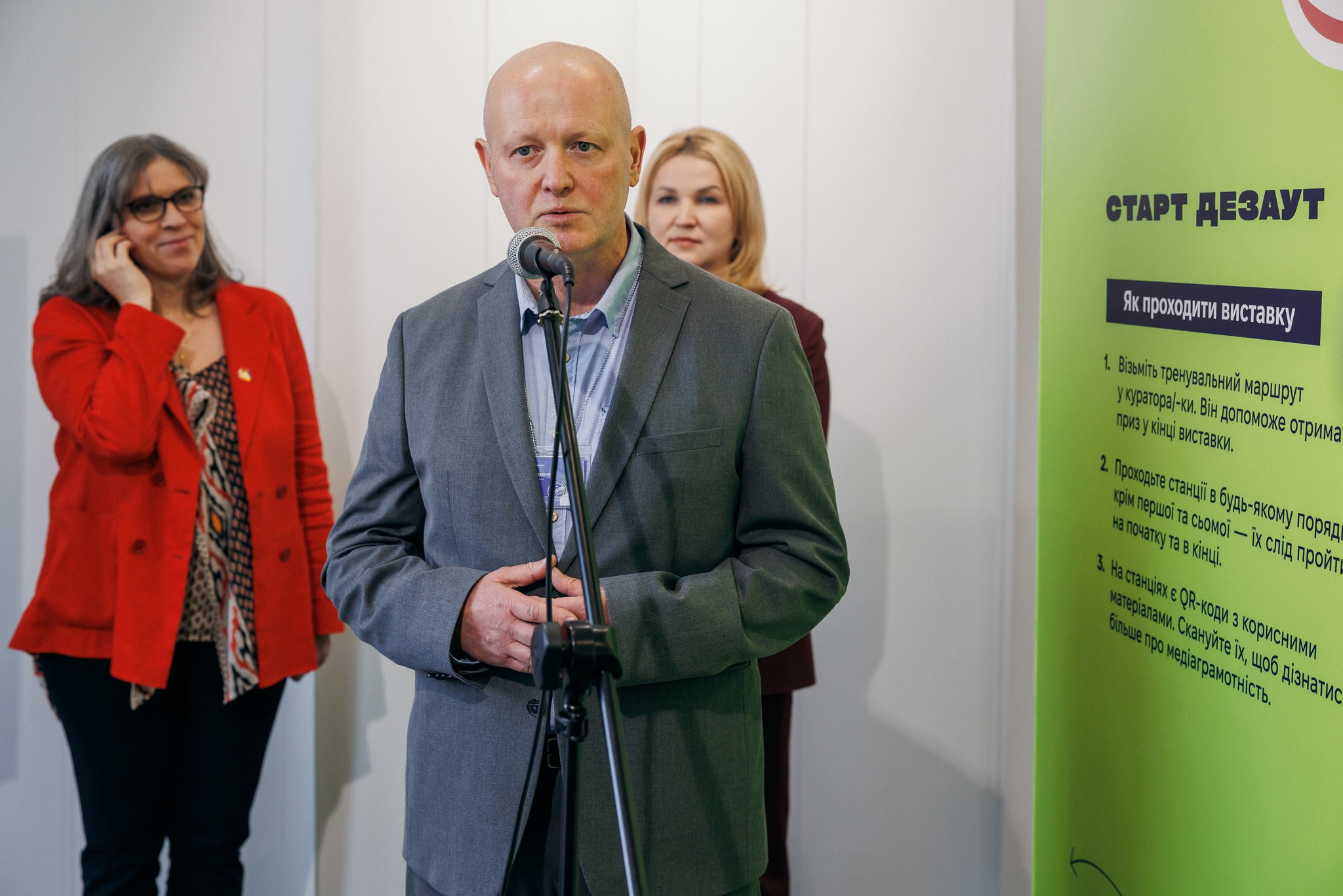 Урочисте відкриття виставки #ДезАут відбулося за участі високоповажних гостей: заступниці голови місії Посольства Канади в Україні Кристіан Руа, голови правління «Інтерньюз-Україна» Костянтина Квурта та очільниці Музею історії Києва Victoria Mukha. Їхня присутність підкреслила міжнародний рівень та значущість заходу для протидії дезінформації.