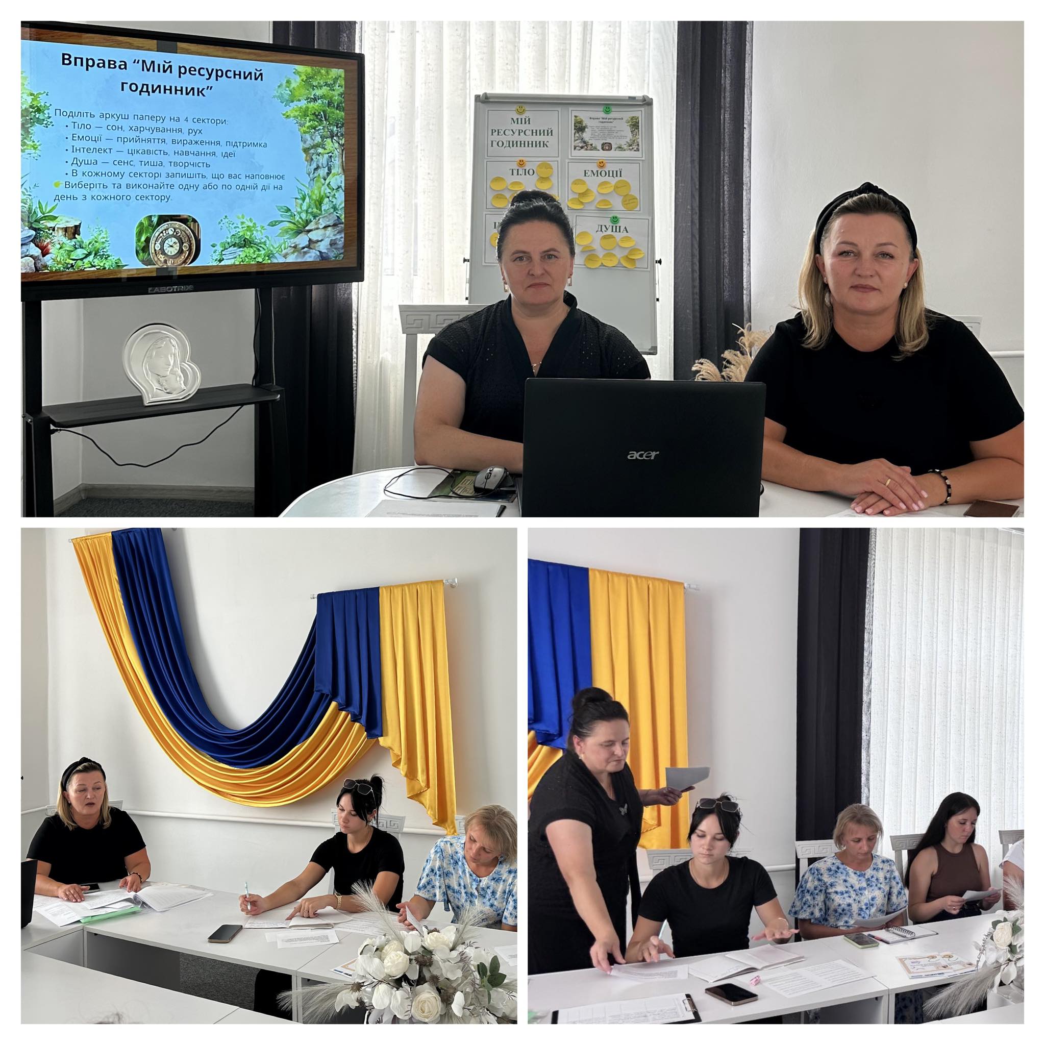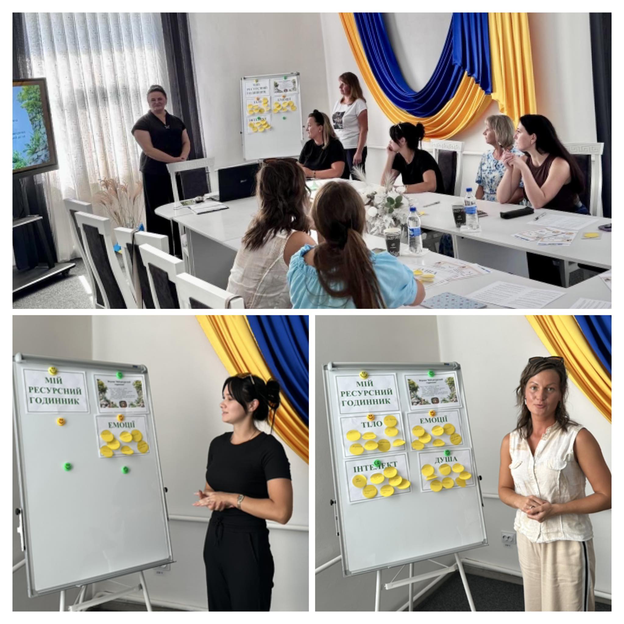 🔸 Професійне вигорання — як зберегти ресурсність і мотивацію в умовах значного емоційного навантаження. Це одна з найактуальніших проблем сучасних педагогів, тому було проведено вправу «Мій ресурсний годинник», спрямовану на розвиток навичок саморегуляції та відновлення сил.