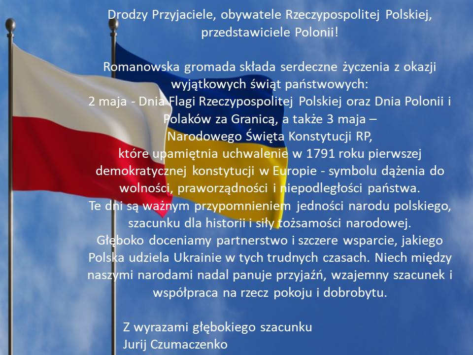 Романівська громада щиро вітає польський народ із Днем Прапора та Днем Конституції Республіки Польща!