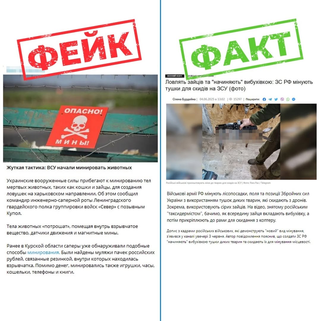 ⚡️російська пропаганда поширює фейки, що ЗСУ нібито мінують тіла мертвих тварин на Харківському напрямку. Йдеться начебто про те, як у нутрощі котів та зайців поміщають вибухівку, рухові датчики чи магнітні міни, аби створювати пастки для російських солдатів.