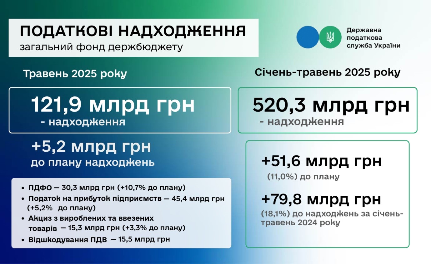 Надходження до загального фонду держбюджету за січень-травень 2025 року склали 520,3 млрд грн, що на 18,1% (79,8 млрд грн) більше, ніж за аналогічний період минулого року. Перевиконання плану надходжень свідчить про ефективну роботу ДПС та сумлінність платників податків.