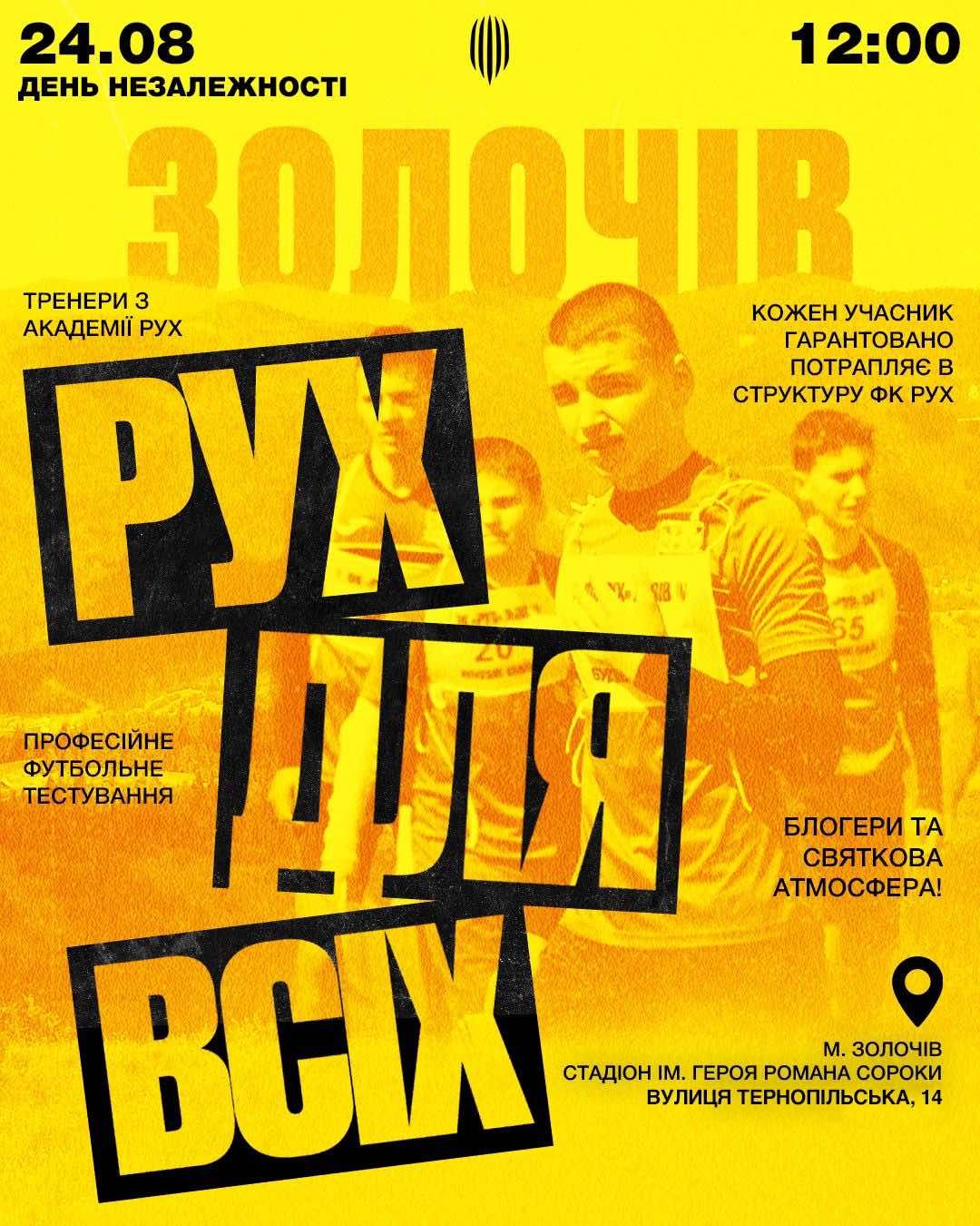 24 серпня, у відзначення Дня Незалежності України, місто Золочів запрошує дітей та молодь на унікальне спортивне свято під назвою «Рух для всіх». Цей захід відбудеться на стадіоні ім. Героя Романа Сороки, що стане епіцентром активного відпочинку та незабутніх емоцій.