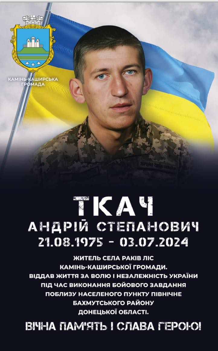 Пам’ять про Андрія Степановича Ткача, справжнього Героя, назавжди закарбується в наших серцях. Він був взірцем мужності, відданості та патріотизму. Щороку, в цей день, ми згадуємо його подвиг, вшановуючи всіх тих, хто загинув, захищаючи нашу Батьківщину. Світла пам’ять про Андрія буде жити в розповідях його рідних, у спогадах друзів, у шкільних підручниках, як приклад незламності українського духу. Його загибель – це не просто втрата для однієї родини чи одного села Раків Ліс; це біль для всієї країни, яка втрачає своїх найкращих синів. Ми ніколи не забудемо, яку ціну ми платимо за мирне небо над головою. Важко знайти слова, щоб висловити весь біль і скорботу, що охопила нас рік тому. Сім’я Андрія, його близькі та друзі переживають непоправну втрату. Ми щиро співчуваємо рідним, близьким, побратимам та всім, хто знав Андрія Ткача. Нехай Господь дає сили пережити цю скорботу. Кожен полеглий воїн залишає по собі порожнечу, яку не заповнити, але водночас він залишає спадщину – спадщину мужності та любові до рідної землі. Ця спадщина надихає нас продовжувати боротьбу за вільну та незалежну Україну, за яку Андрій Степанович віддав своє життя. Життя військовослужбовця Андрія Ткача обірвалося, але його подвиг буде вічним нагадуванням про те, що свобода не дається даром. Герої не вмирають – вони живуть у нашій пам’яті, у наших серцях, у кожному світанку, який настає завдяки їхній жертовності. Ця гірка річниця – це нагода ще раз замислитися над значенням їхнього подвигу та над нашим обов’язком перед ними. Ми маємо пам’ятати кожного Героя, який захищав нас, і продовжувати їхню справу. Український народ ніколи не забуде своїх захисників. Вічна пам’ять Андрію Степановичу Ткачу та всім Героям, що полягли за Україну!