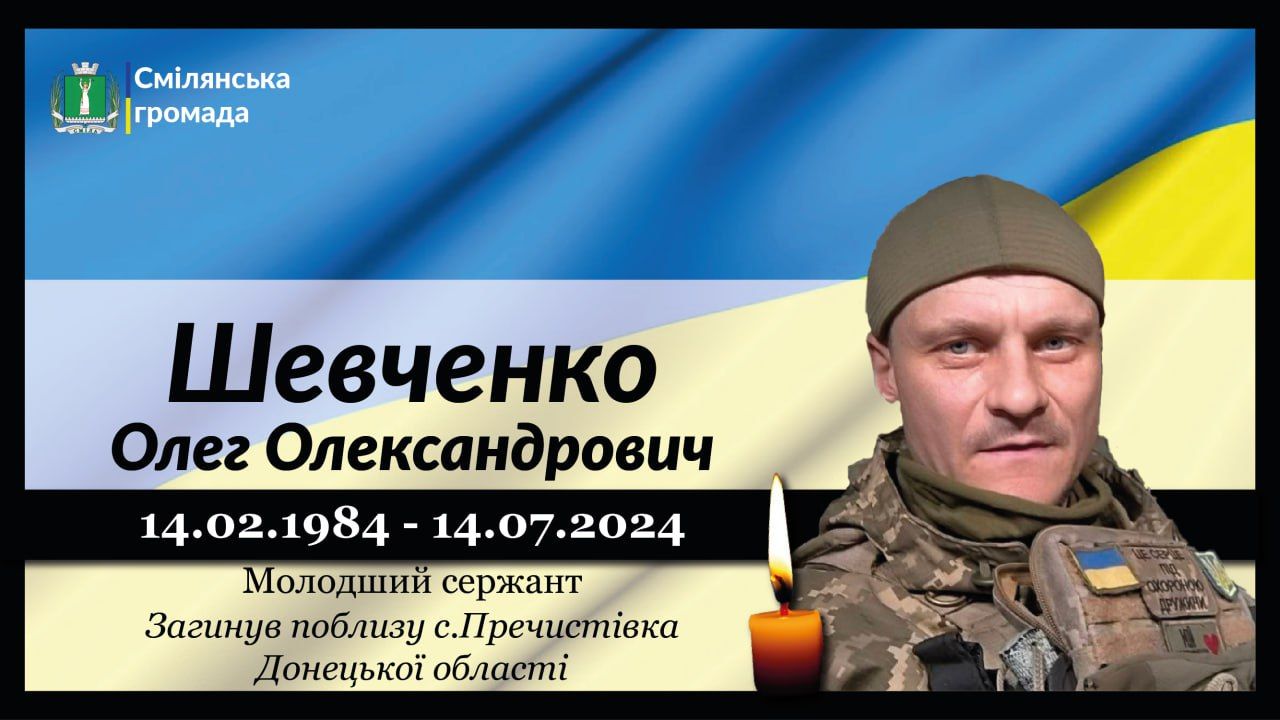 40-річний молодший сержант Олег Олександрович ШЕВЧЕНКО загинув 14 липня 2024 року внаслідок артилерійського обстрілу поблизу н.п. Пречистівка Волноваського району Донецької області.
