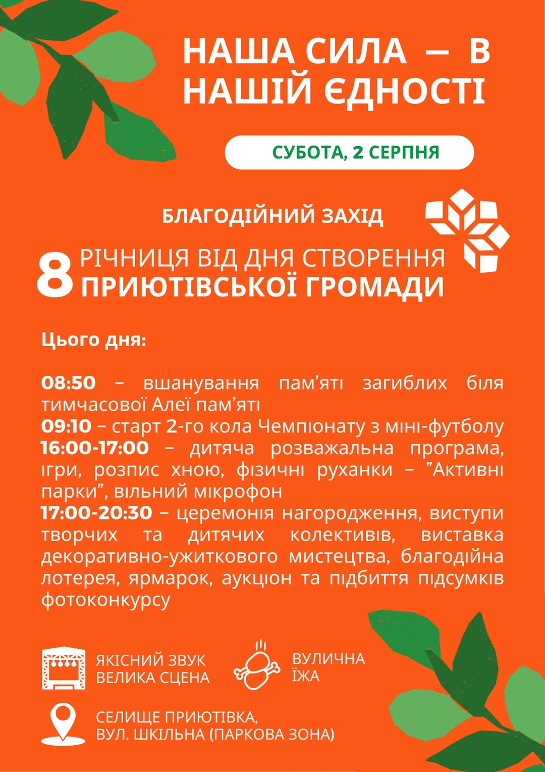 Запрошуємо всіх мешканців та гостей на особливий благодійний захід, присвячений річниці заснування нашої Приютівської громади. Це чудова нагода зібратися разом, відсвяткувати досягнення та зміцнити нашу єдність. Подія відбудеться 2 серпня в мальовничому селищі Приютівка, на вулиці Шкільній, у затишній парковій зоні, яка стане епіцентром святкування. Ми підготували насичену програму, яка задовольнить кожного.