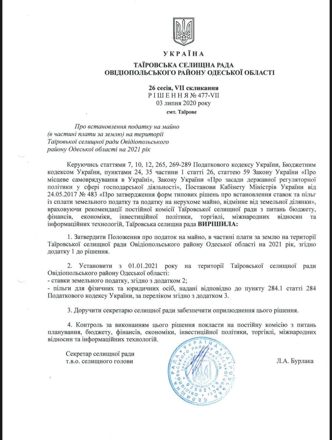 Шановна громадо!Останнім часом активно обговорюються та навіть маніпулюються факти навколо ставок земельного податку для території, відомої як причал 121. З метою уникнення будь-яких непорозумінь та викривлення правди, ми прагнемо надати вичерпну офіційну інформацію, що базується на чинних документах та рішеннях Таїровської селищної ради.Основне положення полягає в тому, що рішення про ставки земельного податку на причалі 121 було ухвалено ще у 2020 році і воно залишається чинним. Зокрема, 3 липня 2020 року, рішенням Таїровської селищної ради №477-VII, були офіційно затверджені ставки земельного податку для різноманітних категорій земель. До цього переліку увійшли й ділянки, де розташовані так звані «домоволодіння на причалі 121».Це рішення було прийняте повним складом депутатів попередньої каденції та офіційно підписане тодішнім виконувачем обов’язків селищного голови – секретарем ради Ларисою Бурлакою. Саме цей документ, що має повну юридичну силу, слугує безпосередньою підставою для нарахування податку, відповідно до всіх норм та вимог чинного українського законодавства.Важливо підкреслити, що ці ставки не є новими і не були штучно завищені. Вони діють безперервно вже пʼятий рік поспіль, починаючи з моменту їхнього офіційного затвердження. Розмір цих ставок повністю відповідає нормативно-грошовій оцінці землі, що була встановлена саме на час ухвалення згаданого рішення. Отже, вони не є витвором нинішнього керівництва громади, а були затверджені значно раніше і залишаються актуальними та обов’язковими для виконання, допоки їхній перегляд не відбудеться відповідно до встановленої законом процедури.Особливий інтерес викликає той факт, що особа, яка у 2020 році виконувала обов’язки голови ради та особисто підписала згадане рішення про ставки земельного податку — Лариса Бурлака — на сьогодні є діючою депутаткою Таїровської селищної ради. І водночас саме вона активно виступає проти тих самих ставок, які сама ж затвердила чотири роки тому. Така невідповідність у позиції викликає щонайменше здивування та ставить під сумнів послідовність дій, адже саме послідовність є наріжним каменем довіри до представника громади.Закликаємо усіх членів громади діяти виключно в межах правового поля. Необхідно усвідомити, що податки – це не каральний захід, а життєво важливий ресурс для розвитку нашої громади. Саме за рахунок податкових надходжень фінансуються наші освітні заклади – школи та дитячі садочки, здійснюється благоустрій території, розвивається інфраструктура, а також надається вкрай необхідна допомога нашим захисникам.Спекуляції на тему ставок податку та поширення неправдивої інформації є, по суті, спробою відволікти увагу громади від справжніх проблем та реальних досягнень. Такі дії створюють штучний конфлікт, який не базується на об’єктивній правді, а переслідує виключно політичні інтереси. Ми закликаємо до відповідальності та прозорості у всіх питаннях, що стосуються життєдіяльності громади.