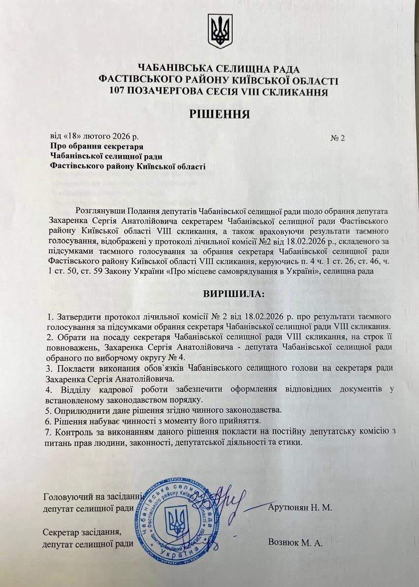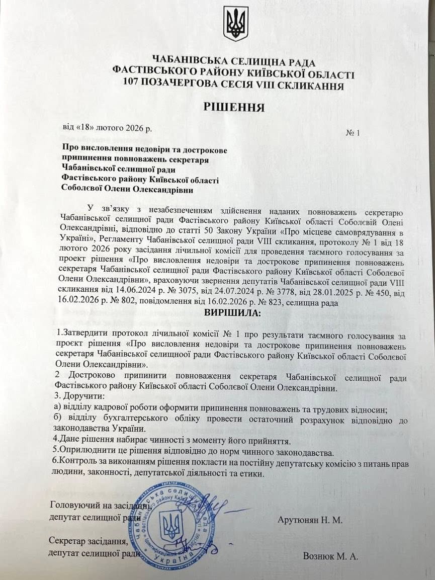 18 лютого 2026 року відбулося засідання 107-ї позачергової сесії Чабанівської селищної ради VIII скликання. Головним питанням порядку денного стало висловлення недовіри та дострокове припинення повноважень секретаря ради.
