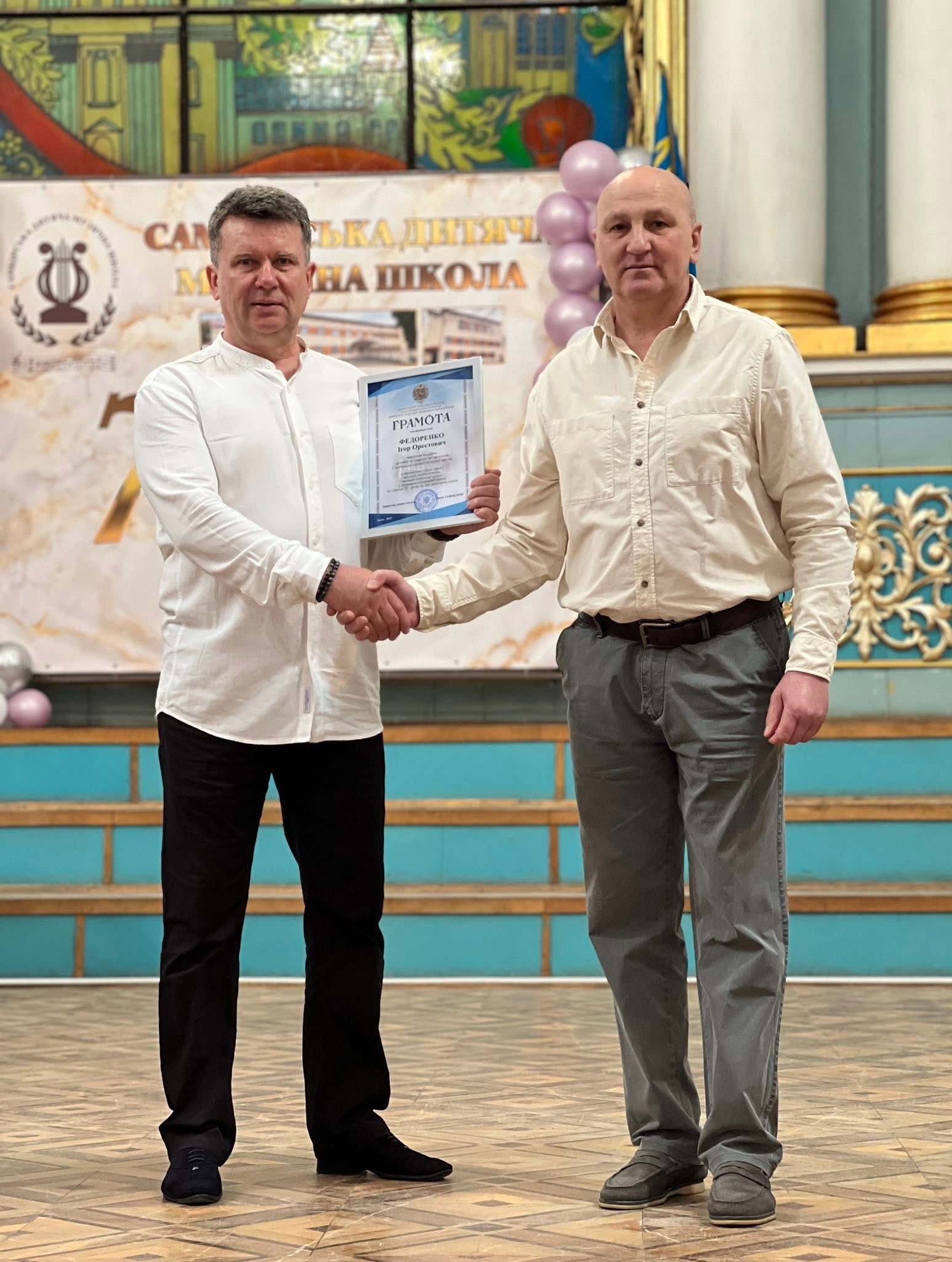 Самбірський міський голова Юрій Гамар звернувся з вітальними словами до колективу школи та глядачів. Він висловив щиру подяку педагогам за їхню самовіддану працю, за збереження традицій та за те, що навчають дітей відчувати прекрасне. Також він подякував учням за їхнє натхнення, старання та любов до музики. Юрій Гамар наголосив, що мистецтво робить світ кращим. «З ювілеєм, друзі!» – завершив він своє привітання. Музична школа – це місце, де народжуються таланти, де діти знаходять себе і де виховується любов до мистецтва. Ювілей школи – це свято для всього міста, адже саме тут формується майбутнє української культури.
