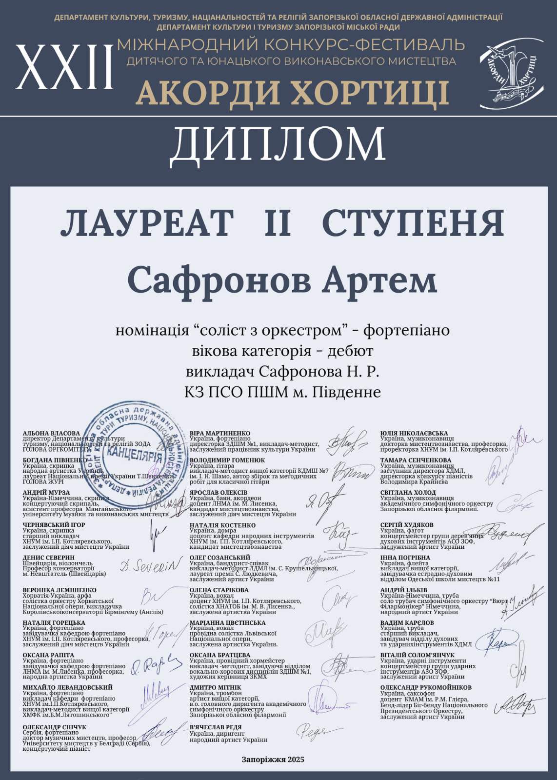 Вітаємо Артема Сафронова з отриманням ІІ премії на “XXII Міжнародному конкурсі «Акорди Хортиці»! Це визначна подія, яка підкреслює талант юного піаніста та наполегливу працю його викладача.