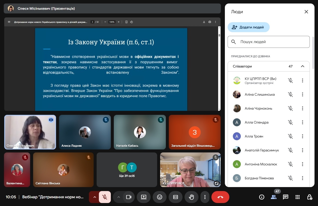 Усі учасники вебінару, що відбувся 22 травня 2025 року, переконані у важливості дотримання культури та правил спілкування й написання в діловому та професійному мовленні. Цей захід був ініційований КУ ЦПР ПП Віньковецької селищної ради Світланою Саврій, на запити керівників ЗЗСО, ЗДО, вчителів-філологів, працівників апарату селищної ради та старост сіл. Під час віртуального спілкування обговорювалася тема «Дотримання норм нового Українського правопису в діловому мовленні».