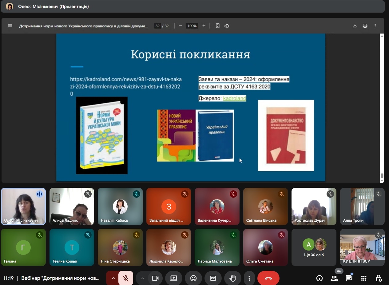 Спікером вебінару виступила Місінькевич Олеся Михайлівна, кандидат філологічних наук, доцент кафедри теорії та методики суспільно-гуманітарних дисциплін ХОІППО. Вона ілюстративно та доступно, спираючись на нормативне регулювання ділових паперів, прокоментувала низку змін, внесених до нової редакції Українського правопису.
