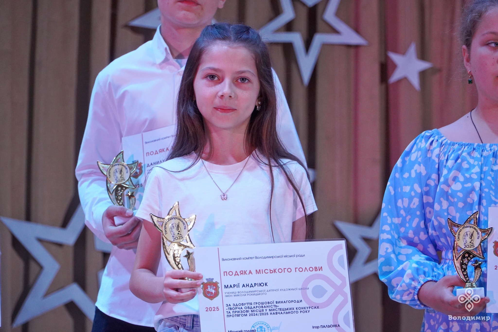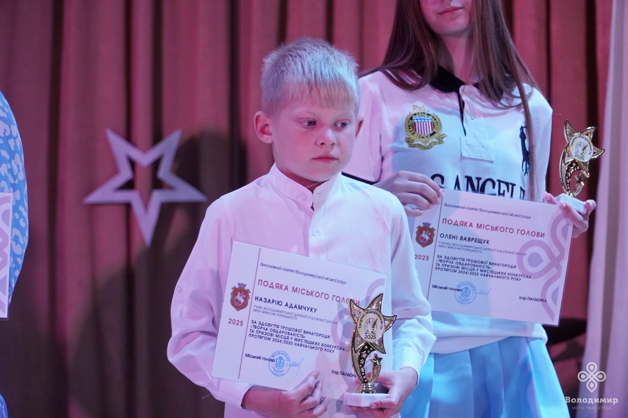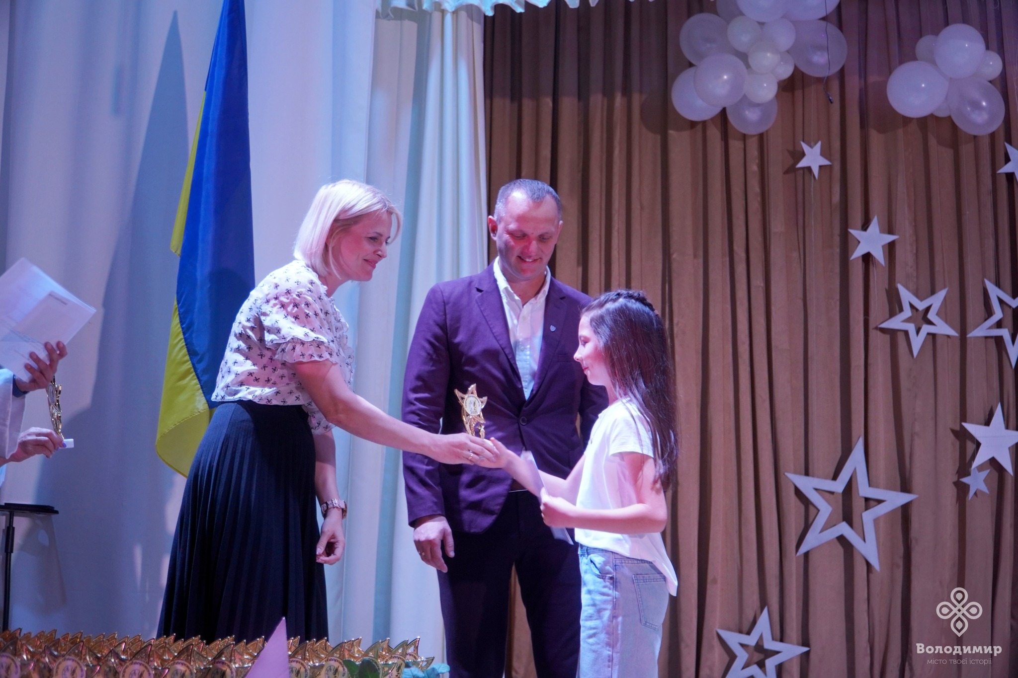 🏆 Після привітань очільниця відділу культури і мистецтва Олена Омелюх та Іван Юхимюк вручили Подяки міського голови, грошові винагороди, статуетки «Творча обдарованість» 52-ом учням Володимирської дитячої музичної школи та 107 учням Володимирської дитячої художньої школи імені Миколи Рокицького.