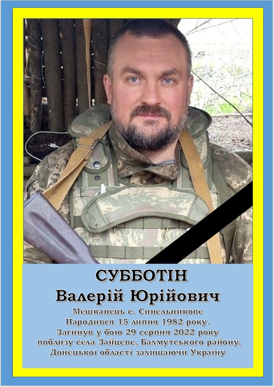 Сьогодні минає три роки від дня героїчної загибелі нашого земляка, старшого солдата Валерія Юрійовича Субботіна. 29 серпня 2022 року він віддав своє життя у запеклих боях біля селища Зайцеве на Донеччині. Героїчна смерть настала внаслідок артилерійського обстрілу, коли Валерій мужньо виконував свій військовий обов’язок у складі 53-ї окремої механізованої бригади імені князя Володимира Мономаха. Його відданість Україні та самопожертва є прикладом для всіх нас.
