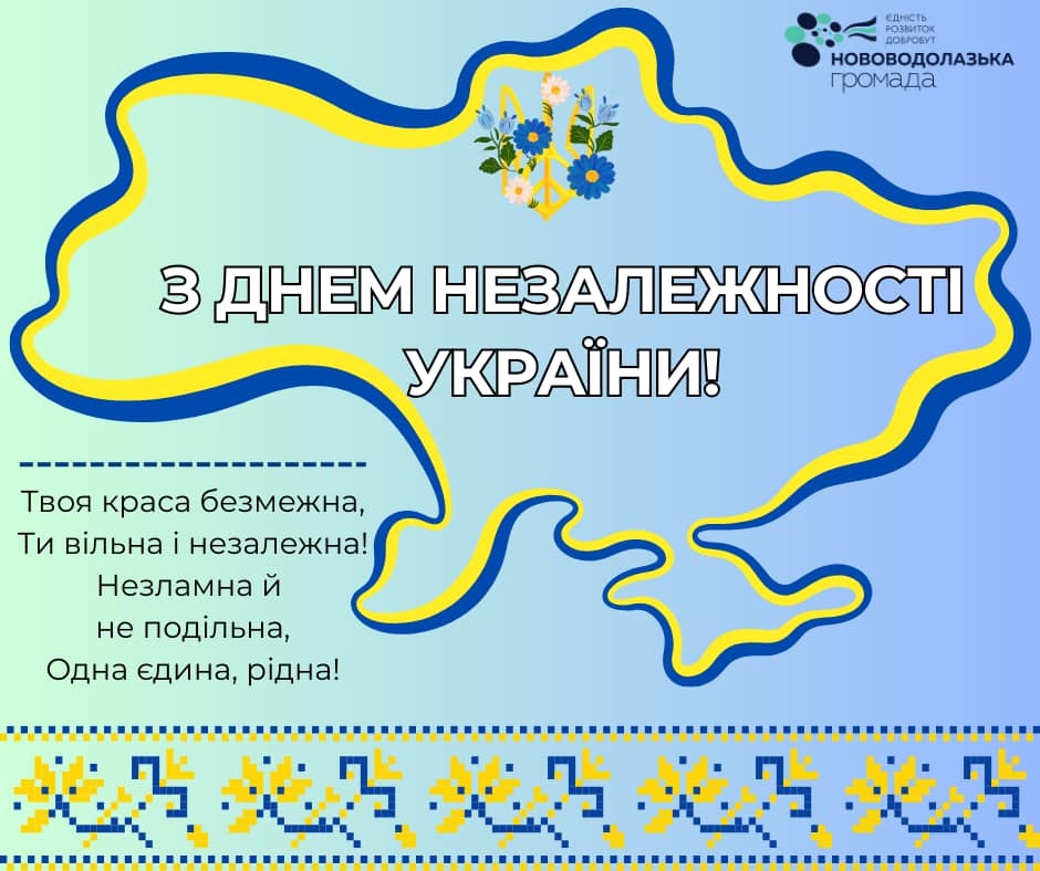 Сердечно вітаємо всіх мешканців Нововодолазької громади з величним національним святом – Днем Незалежності України! Це свято символізує не лише гордість за наше сьогодення, а й непохитну віру в перемогу добра над злом, у здобуття миру та омріяної світлої Перемоги. Ми висловлюємо глибоку шану всім, хто зі зброєю в руках захищає незалежність нашої Батьківщини. Вічна пам’ять і слава полеглим Героям, чиї подвиги навічно закарбовані в наших серцях! У цей знаменний День Незалежності бажаємо, щоб у серці кожного українця жила непохитна віра в Україну, у її славне майбутнє, яке ми спільно будуємо. Нехай любов до рідної землі, щоденна сумлінна праця та наша згуртованість додають нам сил і сприяють процвітанню нашої громади. Все є і буде Україна! 🇺🇦
