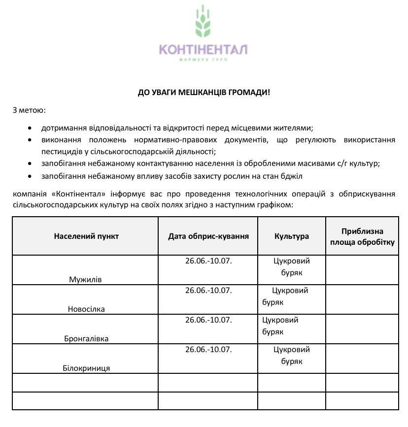 Компанія “Контінентал Фармерз Груп” повідомляє про обприскування цукрового буряка на території населених пунктів Підгаєцької громади: с.Мужилів, с.Новосілка, с.Бронгалівка, с.Білокриниця.