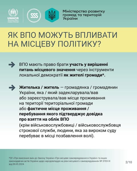 Об’єднання внутрішньо переміщених осіб (ВПО) може стати потужним інструментом для досягнення спільних цілей, зміцнення соціальної справедливості та забезпечення реалізації прав усіх ВПО. Внутрішньо переміщені особи, які знайшли прихисток у різних громадах України, мають повне право брати активну участь у вирішенні питань місцевого значення. Це право гарантується чинним законодавством України.