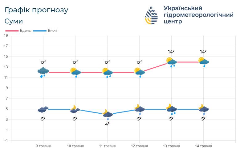 У ніч на 11 травня по Сумській області синоптики попереджають про можливі заморозки на поверхні ґрунту, температура може опуститися до 0..-5°C (І рівень небезпечності, жовтий). Це становить значну загрозу для рослин, особливо для тих, які вже почали цвісти. Фермерам та власникам присадибних ділянок рекомендується вжити заходів для захисту своїх насаджень.