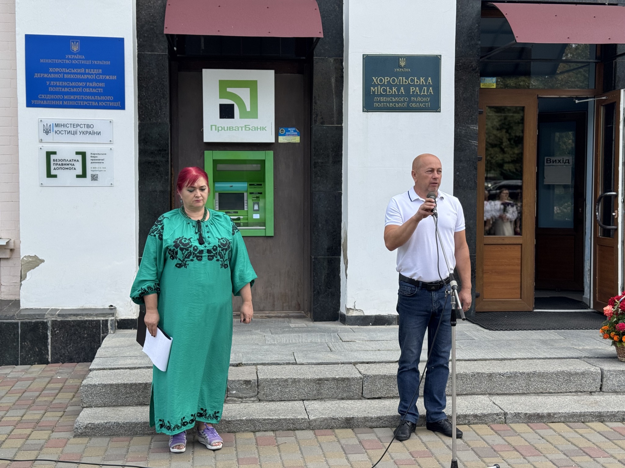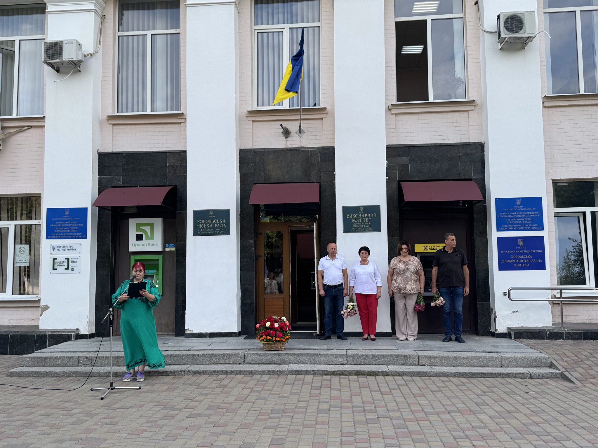 Цього року почесне право підняти Прапор України перед адмінприміщенням міської ради було надано спеціалісту відділу освіти, молоді та спорту Хорольської міської ради Тетяні Поклад та спеціалісту Служби у справах дітей виконавчого комітету міської ради Віталію Плющію. Це стало символом того, як різні сфери життя громади об’єднуються навколо національних цінностей.
