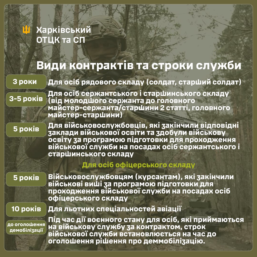 Для громадян України, які вступають на військову службу за контрактом під час воєнного стану, встановлено такі строки служби: