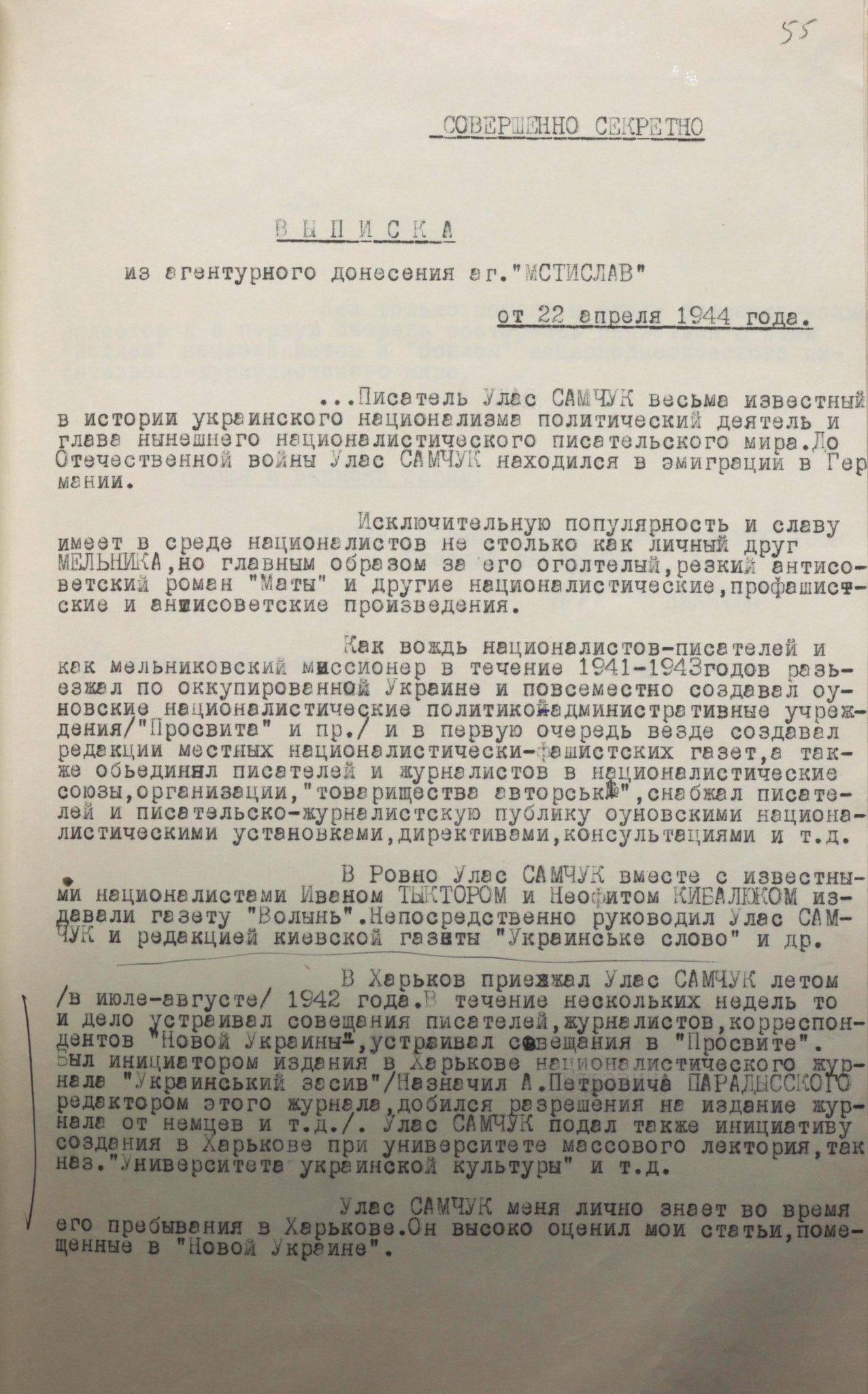 Із Харкова надіслали витяг із повідомленням агента «Мстислава», в якому про У. Самчука згадувалося таке: