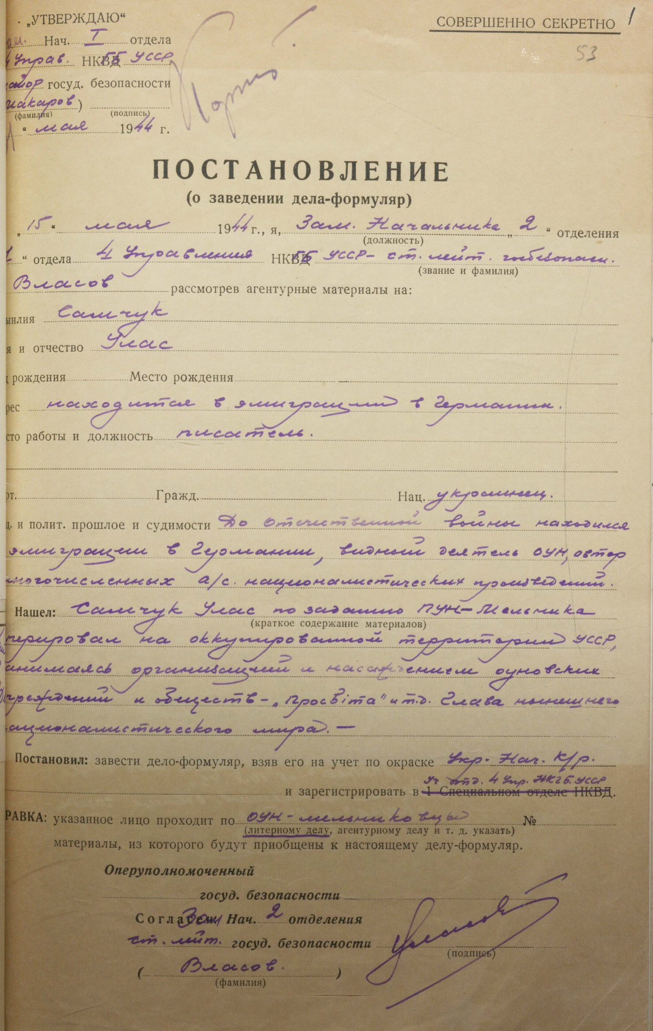На виконання вказівок із москви в кдб урср підняли всі матеріали, які зберігалися на письменника у відкритих державних і оперативних архівних фондах. З’ясувалося, що ще у 1936 році нквс урср завів на нього справу-формуляр. У першому документі, долученому до справи, йшлося про те, що У. Самчук приїздив із Праги до Парижа для збирання матеріалів для книги про життя і діяльність Симона Петлюри. Водночас підозрювали, що то було лише прикриття, а насправді він виконував якісь завдання по лінії ОУН.