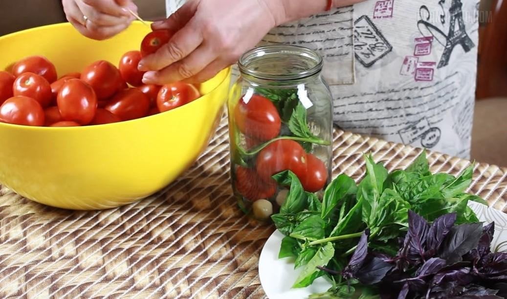 У кожному помідорі біля плодоніжки зробіть кілька проколів зубочисткою або виделкою — це допоможе уникнути розтріскування шкірки під час заливання гарячою водою. Акуратно заповніть банку помідорами, чергуючи їх зі свіжими гілочками базиліка.