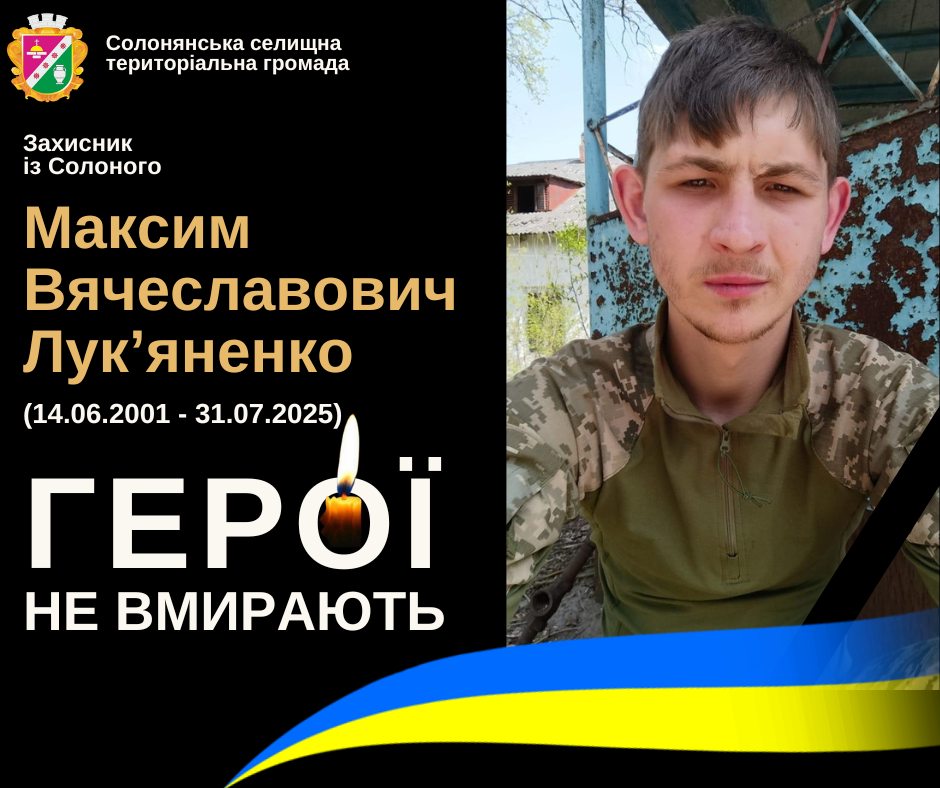 🇺🇦 Солонянщина глибоко сумує… З нестерпним болем у серці повідомляємо про героїчну загибель Максима В’ячеславовича Лук’яненка. Він віддав своє життя за свободу та незалежність України, залишаючись вірним військовій присязі та рідній землі. Його мужність, відданість і самопожертва слугуватимуть вічним прикладом справжнього патріотизму для всіх нас. Максим В’ячеславович став на варту Небесного Воїнства, захищаючи наше мирне майбутнє. Солонянська селищна рада та вся громада висловлюють найщиріші співчуття родині та близьким загиблого Героя. Нехай Господь дарує вам сили витримати невимовний біль цієї непоправної втрати. Ми сумуємо разом із вами, пам’ятаємо та безмежно вдячні. Церемонія прощання з нашим Героєм відбудеться 2 серпня о 12:00 за адресою: селище Солоне, вул. Чорновола В’ячеслава, 8А (Церква Святої Покрови Богородиці). Запрошуємо всіх, хто хоче віддати шану нашому Захиснику та гідно провести його в останню путь. Герої не вмирають, вони стають Янголами, що оберігають нас із Вічності. Світла пам’ять і вічна слава нашому Захиснику! Слава Україні! Героям слава! #Солонянська_ТГ #ГероїНеВмирають