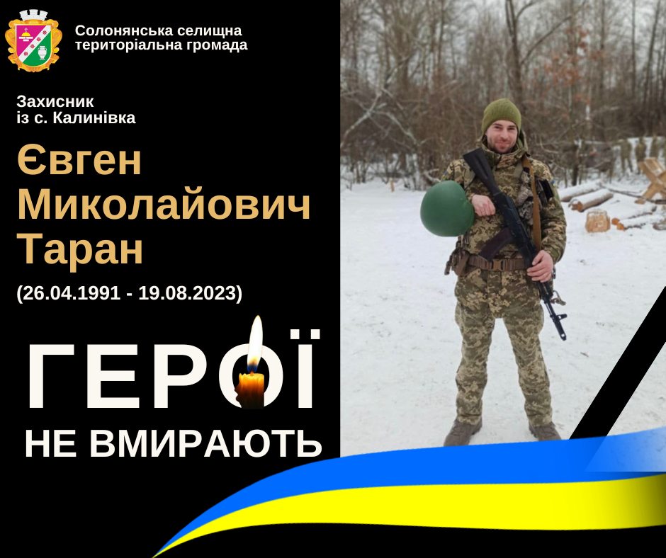 Євген Таран самовіддано став на захист рідної землі, мужньо та безстрашно боровся проти російських окупантів до останнього подиху. Солонянська селищна рада разом з усією громадою висловлює найщиріші співчуття родині та близьким загиблого Воїна. Розділяємо ваше горе, сумуємо разом з вами та підтримуємо в цю важку годину. Низько схиляємо голови перед його мужністю, відвагою та героїзмом.
