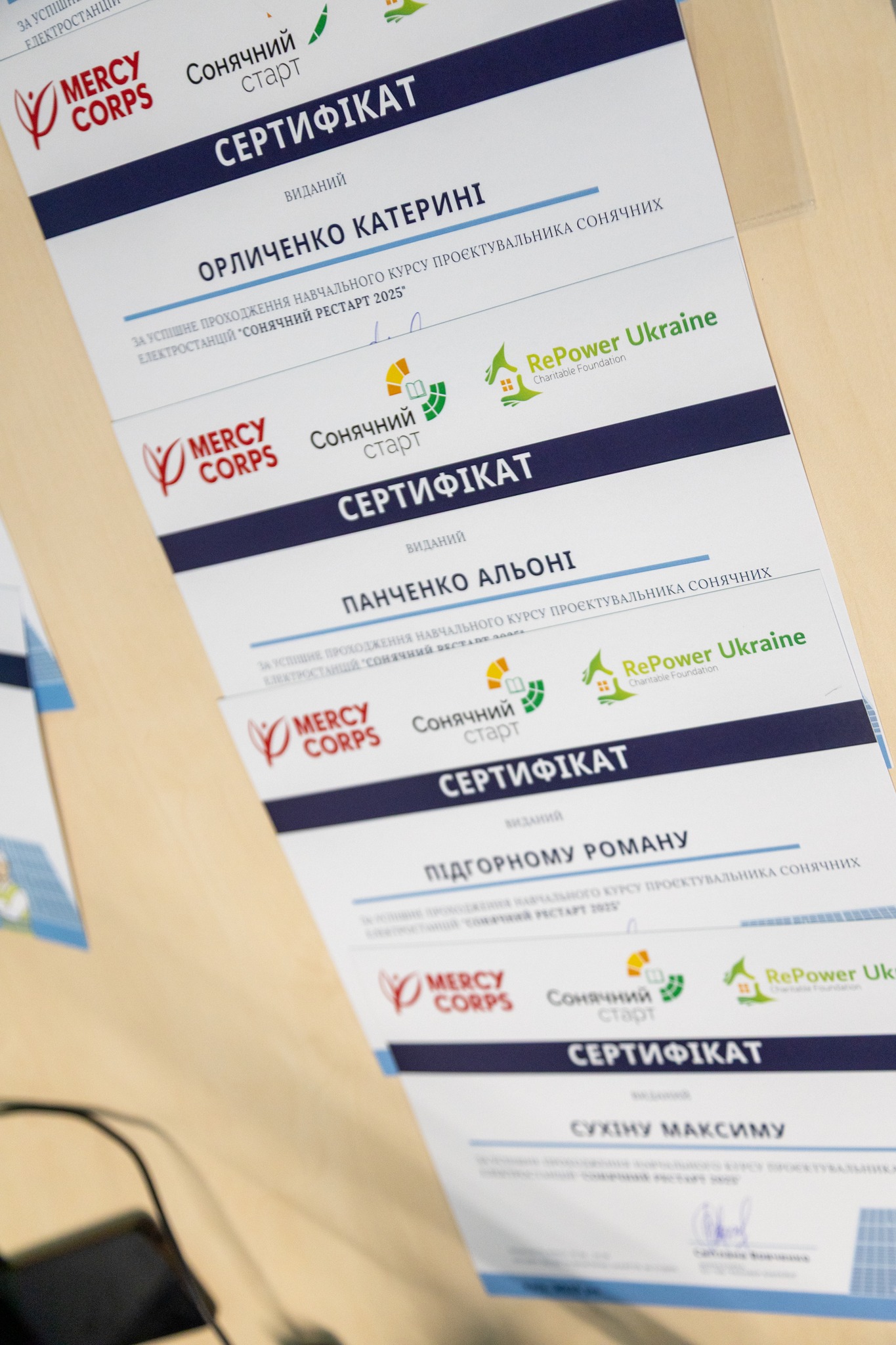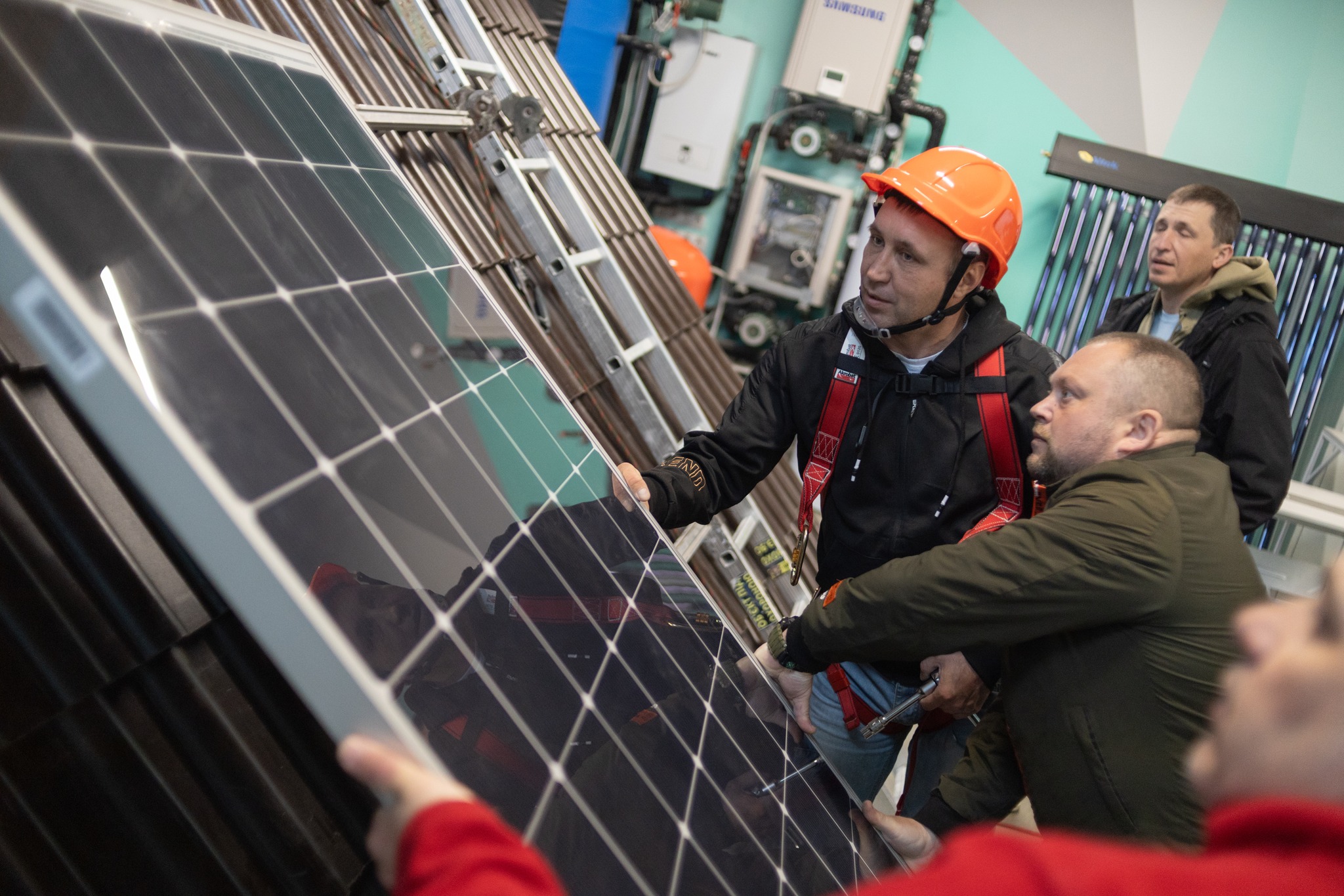 Навчальна програма для монтажників охоплювала знання про складові СЕС, принципи підбору обладнання та правила підключення. Випускники пройшли й практичний етап: монтували сонячні панелі, працювали з кріпленнями, збирали повноцінну станцію на похилій поверхні.