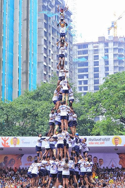 Традиційно, учасники фестивалю формують «живі» вежі, щоб дістатися до глиняного горщика з йогуртом, підвішеного високо над землею. Цей обряд символізує народження бога Крішни. Команда Kokan Nagar Govinda Pathak спільно з фондом Sanskruti Yuva Pratisthan Trust змогла побити десятирічний рекорд у дев’ять рівнів, встановивши нову найвищу живу піраміду.