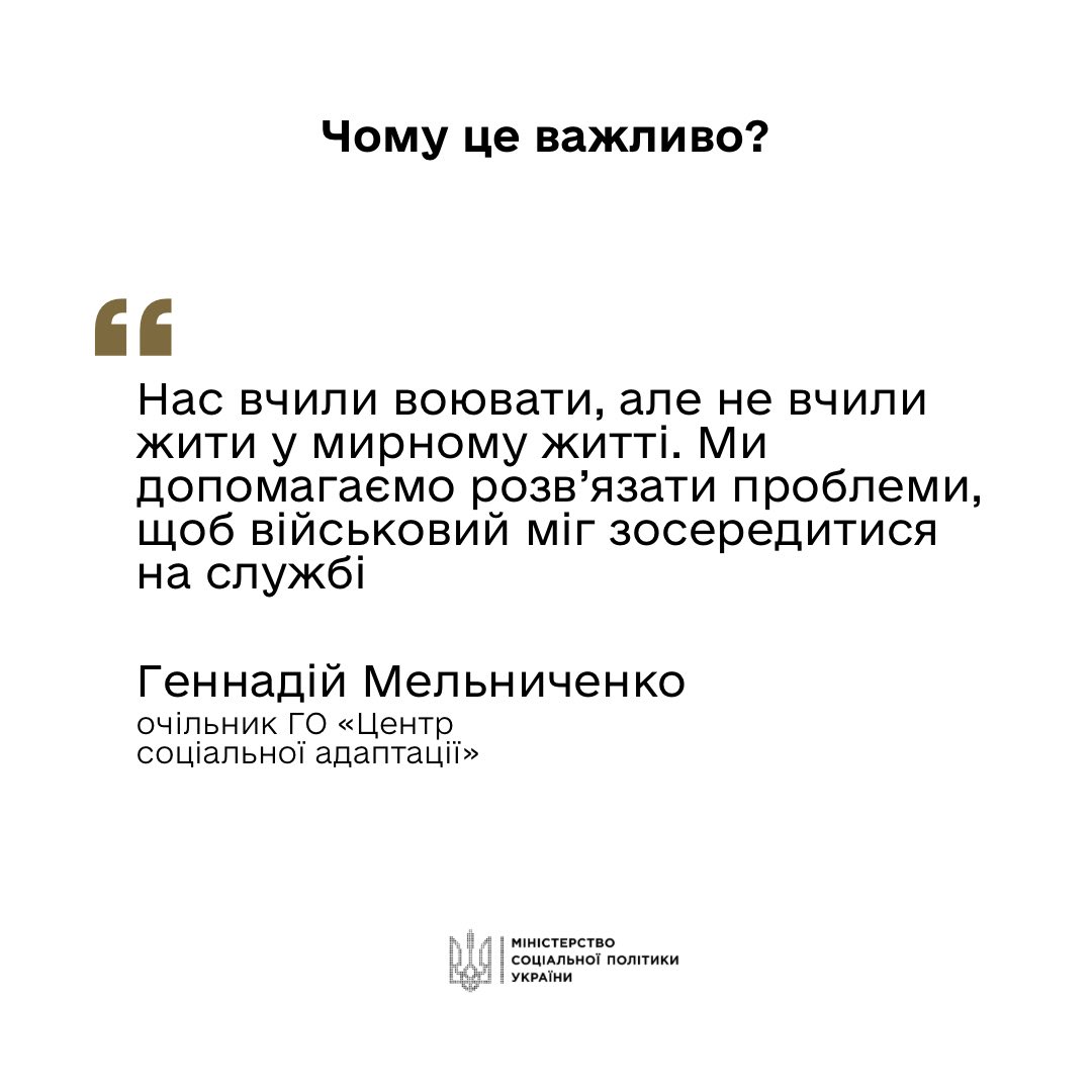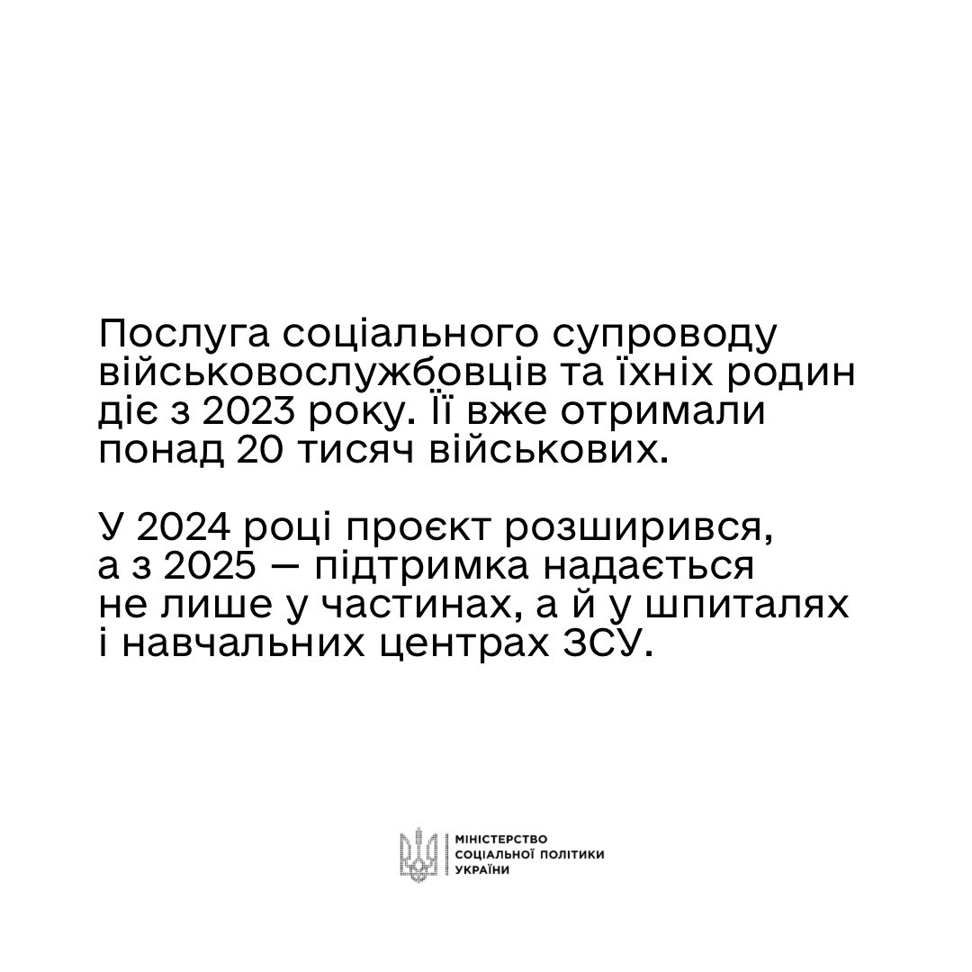 В Україні триває важливий експеримент з соціального супроводу військовослужбовців та їхніх родин, ініційований Мінсоцполітики. З 2023 року понад 20 тисяч людей отримали допомогу та підтримку. Уряд розширює перелік військових частин, шпиталів та навчальних центрів, де ця послуга надається, щоб соціальний супровід був доступнішим для тих, хто цього потребує.
