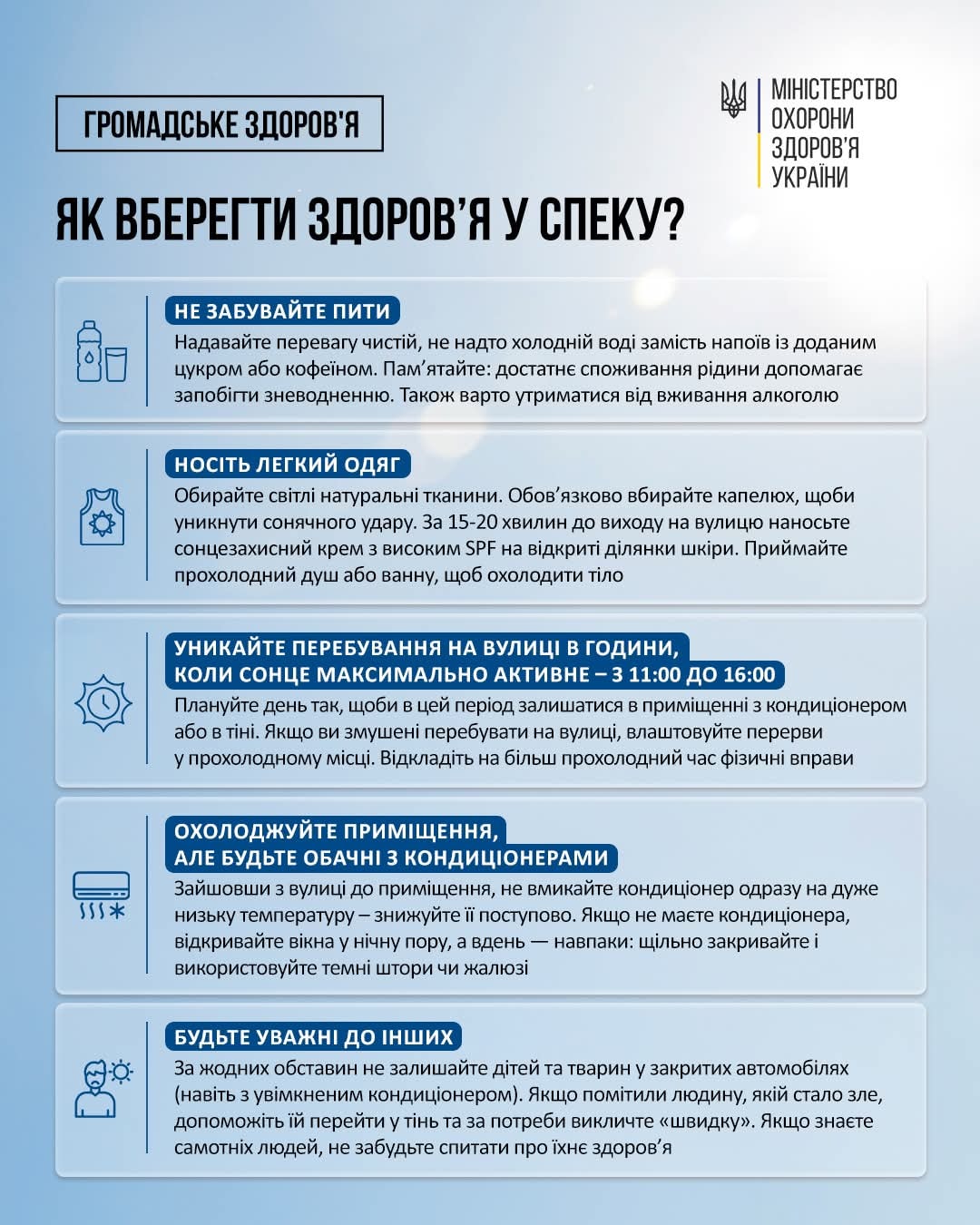 ☀️ Спека знову охоплює Україну, і в цей період надзвичайно важливо приділяти посилену увагу власному здоров’ю та добробуту найуразливіших членів суспільства: дітей, людей похилого віку та тих, хто має хронічні захворювання. Високі температури несуть значні ризики для організму, найнебезпечнішим з яких є тепловий удар. Саме тому сьогодні ми детально розглянемо, як ефективно захиститися від впливу екстремальної спеки та що робити, якщо раптово стався тепловий удар. Розуміння цих базових правил може врятувати життя.🔎 Що таке тепловий удар?Тепловий удар – це критичний стан, що виникає внаслідок перегрівання тіла, коли механізми терморегуляції організму вже не можуть справлятися з відведенням надлишкового тепла. Це може статися через тривале перебування під прямими сонячними променями (сонячний удар) або у задушливому, погано провітрюваному приміщенні з високою температурою повітря та вологістю. Внаслідок цього порушується водний та електролітний баланс, що призводить до збою роботи центральної нервової системи та інших життєво важливих органів. Тепловий удар вимагає негайної медичної допомоги, адже без належного втручання він може призвести до серйозних ускладнень, включаючи пошкодження мозку, нирок, серця та навіть летальний наслідок.🔎 Коли варто запідозрити тепловий удар?Якщо ви знаходилися під впливом високих температур і відчуваєте різке погіршення самопочуття, важливо вчасно розпізнати симптоми теплового удару. До них належать:🔸 Сплутаність свідомості, дезорієнтація у просторі та часі, незв’язне мовлення.🔸 Сильний пульсуючий головний біль, запаморочення.🔸 Нудота, блювання, що може свідчити про інтоксикацію організму.🔸 Прискорене серцебиття та утруднене дихання, відчуття нестачі повітря.🔸 Почервоніння шкіри, яка на дотик стає сухою та гарячою, оскільки організм перестає потіти.🔸 Раптове підвищення температури тіла до 39°C і вище.🔸 Сильна втома, загальна слабкість, млявість.🔸 Короткочасна втрата свідомості, судоми.Ці ознаки є сигналом до негайних дій. Не варто ігнорувати їх, адже кожен втрачений момент може погіршити стан постраждалого.🔎 Що робити, якщо тепловий удар стався?Швидка та правильна перша допомога при тепловому ударі є ключовою для збереження здоров’я та життя людини.🚑 Негайно зателефонуйте за номером 103! Поясніть ситуацію – диспетчер надасть інструкції та надішле бригаду екстреної медичної допомоги.1️⃣ Перемістіть постраждалого в затінене, прохолодне місце. Це може бути кімната з кондиціонером, тінь під деревом або будь-яке інше прохолодне укриття.2️⃣ Розпочніть активне охолодження тіла. Зніміть зайвий одяг. Використовуйте прохолодні вологі рушники або простирадла, обгорніть ними тіло. Прикладайте льодяні пакети (або будь-які холодні компреси) до ділянок великих судин: шия, пахвові западини, пах. Можна обтирати шкіру губкою, змоченою у прохолодній воді.3️⃣ Якщо постраждала людина при свідомості, давайте їй пити прохолодну воду маленькими ковтками. Уникайте солодких напоїв, алкоголю або напоїв з кофеїном, оскільки вони можуть спричинити зневоднення.4️⃣ У випадку блювання, обережно поверніть постраждалого на бік, щоб запобігти аспірації блювотними масами.5️⃣ Постійно стежте за станом людини: її диханням, пульсом та рівнем свідомості до прибуття медичної допомоги.Важлив