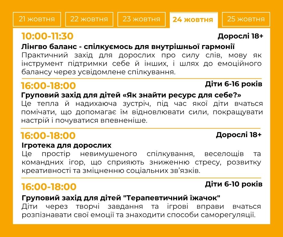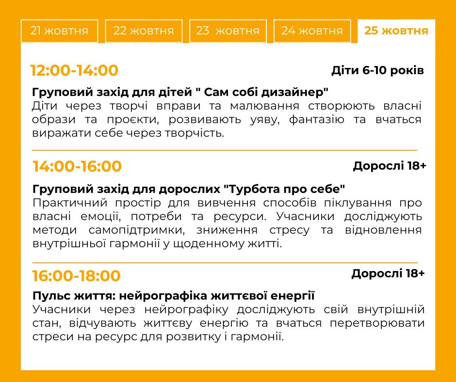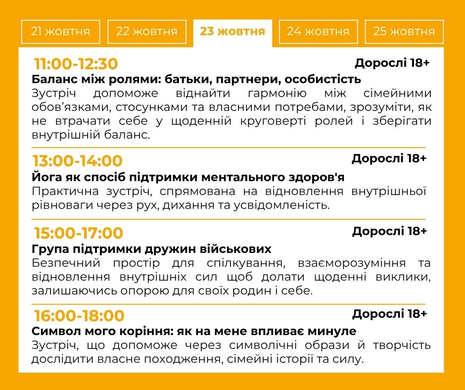 З 23 жовтня всі бажаючі матимуть чудову нагоду відвідати різноманітні заходи, організовані Центром життєстійкості. Ця ініціатива спрямована на допомогу кожному, хто прагне знайти нові способи підтримки себе у складні часи, віднайти внутрішні ресурси для подолання щоденних викликів, а також поділитися власним досвідом та надихнутися історіями інших людей.