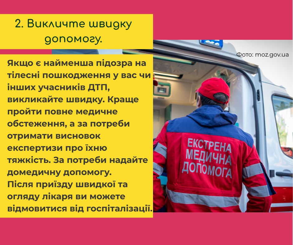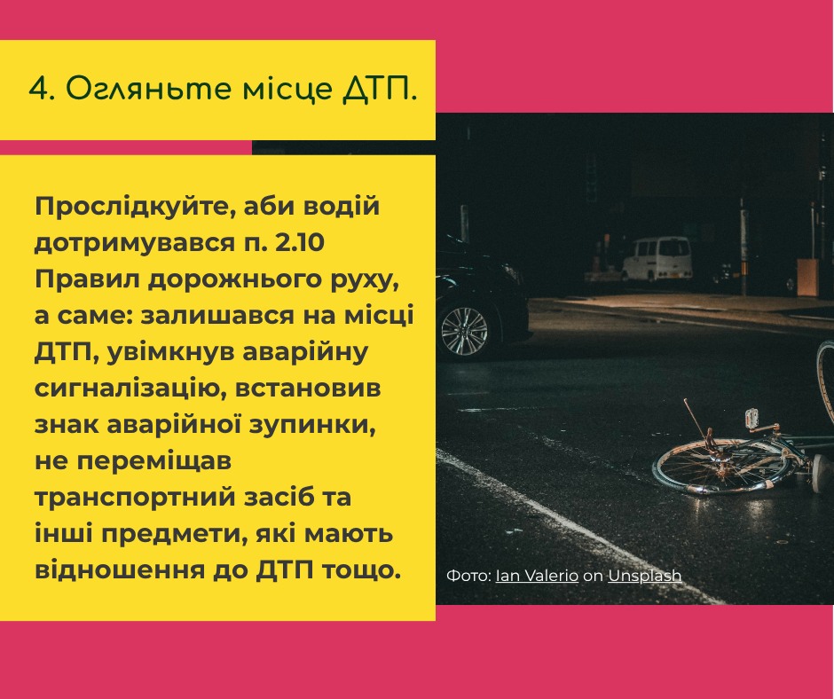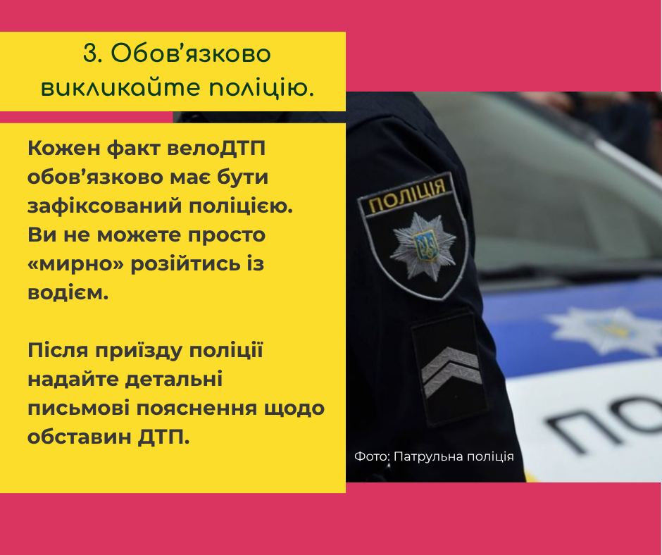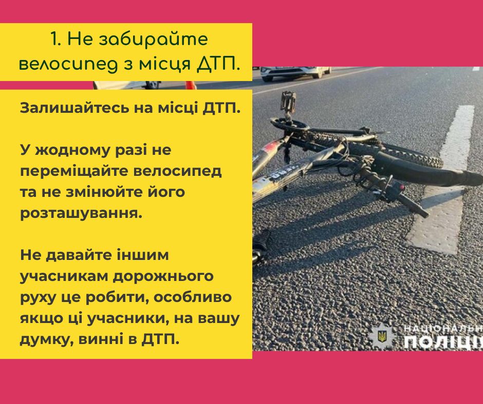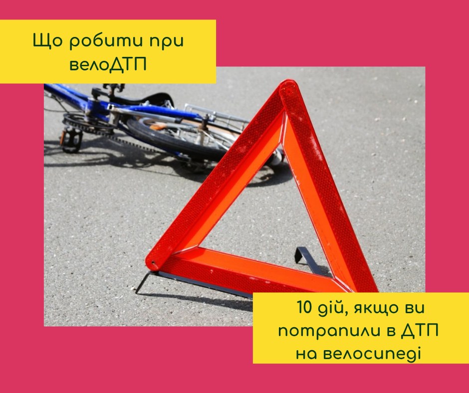 Якщо ви потрапите в ДТП на велосипеді, рекомендуємо такий алгоритм з 10 дій: https://u-cycle.org.ua/articles/shcho-robyty-pry-velo-dtp/