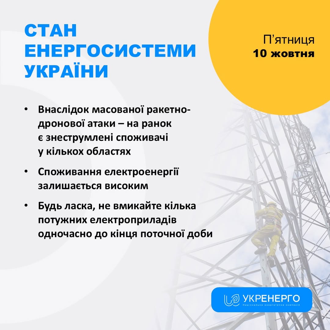 🔹Внаслідок масованої ракетно-дронової атаки – на ранок є знеструмлені споживачі у кількох областях. Ситуація залишається складною.