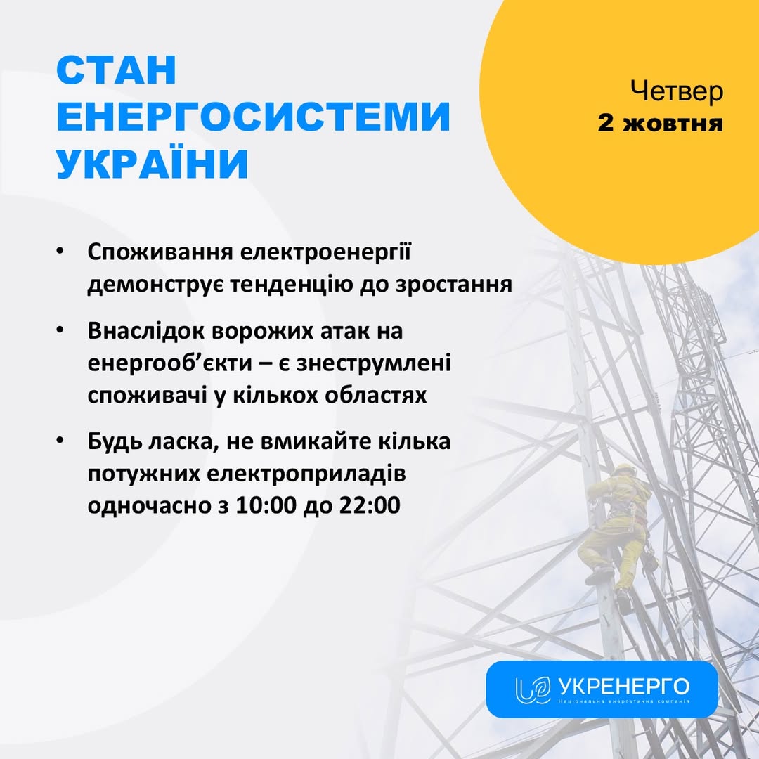Важливо! Ситуація в енергосистемі може змінюватись. Рекомендуємо стежити за актуальними повідомленнями на офіційних сайтах та сторінках у соціальних мережах вашого оператора системи розподілу (обленерго) для отримання найсвіжішої інформації.