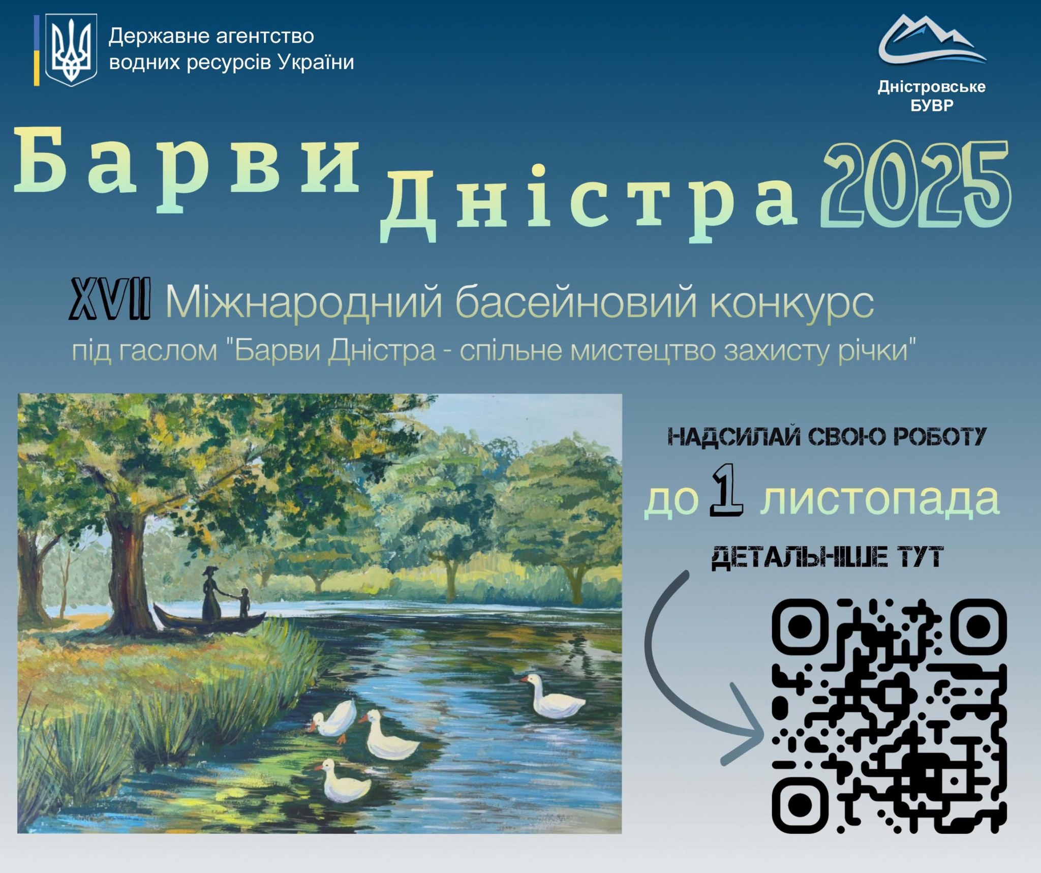 Стартував XVIІ міжнародний басейновий конкурс «Барви Дністра» 2025! Цього року він проходить під гаслом: «Барви Дністра – спільне мистецтво захисту річки». Ця ініціатива є чудовою можливістю для юних талантів та всіх небайдужих мешканців басейну річки Дністер продемонструвати свою любов та турботу про цей унікальний водний ресурс.