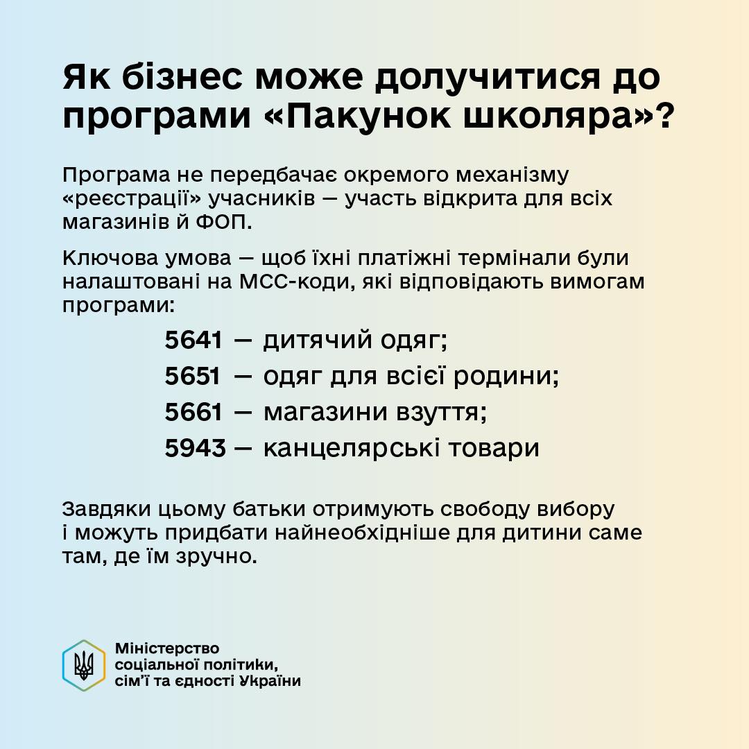 У рамках програми «Пакунок школяра» кожна родина першокласника має можливість отримати 5 тисяч гривень. Ці кошти призначені для покриття витрат на шкільне приладдя, одяг, канцтовари та інші необхідні речі для навчання. Детальна інформація про те, хто саме має право на отримання допомоги, як ефективно використати надані кошти, а також про можливості для бізнесу долучитися до реалізації цієї програми, доступна у матеріалі за посиланням: https://bit.ly/3JVEZWJ.