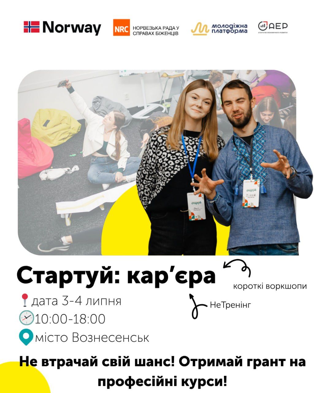 Чи мрієте ви не просто знайти роботу, а впевнено розпочати свій професійний шлях, пройшовши через усі виклики співбесід та створення резюме без зайвого стресу? Це ваш унікальний шанс на успішне працевлаштування, який пропонує не лише знання, а й реальні можливості для розвитку!Воркшоп — НеТренінг “Стартуй кар’єру” – це інтенсивна дводенна програма, розроблена спеціально для молоді віком від 14 до 21 року, яка проживає на території Миколаївської області. Ця ініціатива може кардинально змінити ваше професійне майбутнє, надавши всі необхідні інструменти та знання для впевненого старту. Не пропустіть нагоду інвестувати у своє майбутнє та забезпечити собі успішне працевлаштування.
